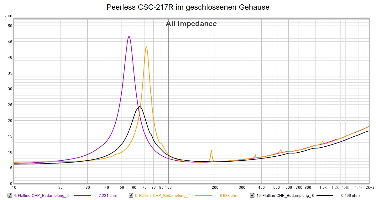 Hier ein kleines Beispiel eines 20cm Basses im geschlossenen Gehäuse. Violett ist die Impedanzkurve des nackten Chassis ohne Gehäuse dargestellt. Die gelbe Kurbe zeigt das Chassis in einem unbedämpften geschlossenen Gehäuse. Man sieht, dass die EInbauresonanz des Chassis nach oben gewandert ist. Ebenso sieht man bei ca. 190Hz und Vielfachen davon weitere Impedanzspitzen. Das sind stehende Wellen aufgrund der Gehäusegeometrie, die sich negativ auf die Wiedergabeeigenschaften auswirken als Fehler im Frequenzgang. Die schwarze Kurve zeigt das Chassis im sorgfältig bedämpften Gehäuse. Man sieht, dass die vorgenannten Resonanzen verschwunden sind und die Einbauresonanz des Chassis gegenüber dem unbedämpften Gehäuse wieder abgesunken ist. Die stärkere Bedämpfung zeigt sich auch am geringeren Höchstwert der Impedanzspitze. (Nicht über die immer noch hohe Resonanzfrequent wundern, das System wird zusätzlich elektrisch beschaltet und kommt dann wie geplant auf etwa 40 Hz)