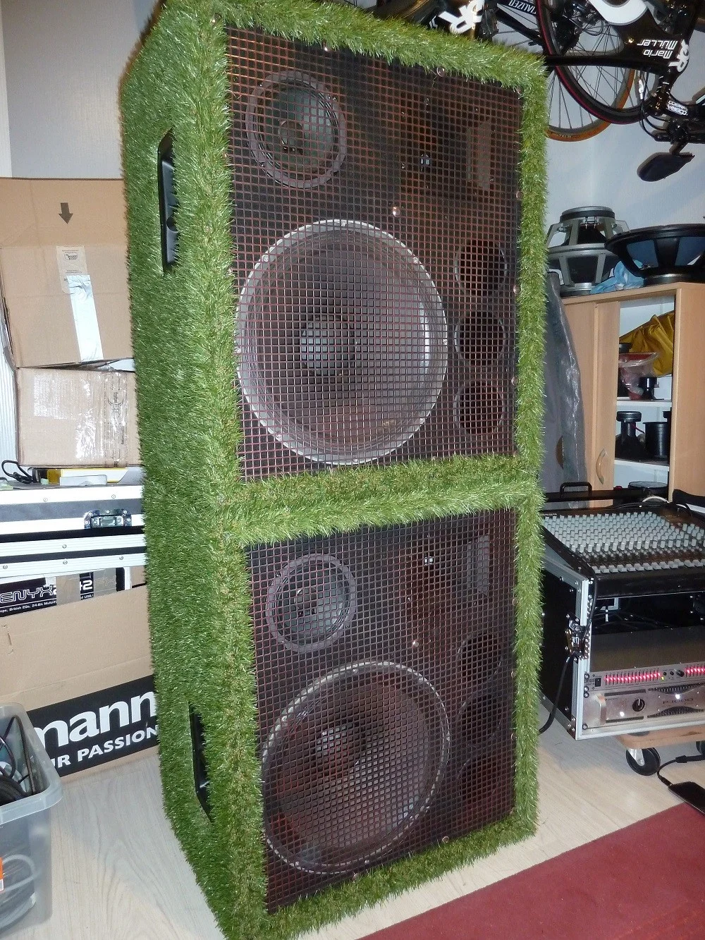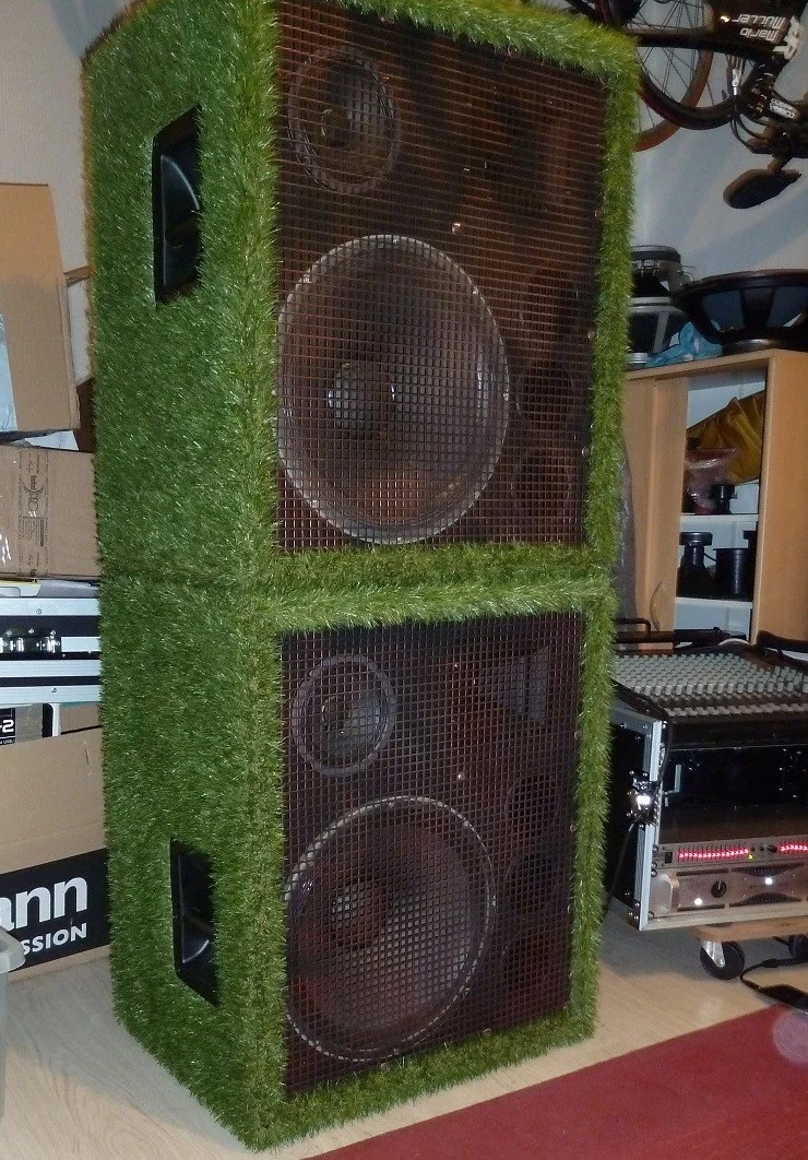 So abgestimmt klingt sie für mich richtig gut: die Substanz ist da, der Ton steht mit lässiger Souveränität im Raum und ist durch die schräge Front und die beiden 3Zöller präsent, knackig und gut ortbar. Der 3er sind übrigens 8Ohmer in Serie, nicht weil einewr nicht laut genug wäre sondern wegen der Belastbarkeit, die so bei rechnerisch 160Watt liegt und das dann noch hinter der Weiche. Die passen hervorragend in das Konzept, weil sie genau da loslegen, wo der Dicktöner nur noch wie ein Gewehr nach vorne ballert, und ihn ohne nervige Härte nach oben ergänzen, da braucht kein Mensch mehr quakige oder harsche Hochtonhörner -definitiv eine meiner bässeren Ideen. Inzwischen habe ich gesehen, dass ein gewisser Herr Hirschfelder das ähnlich macht...