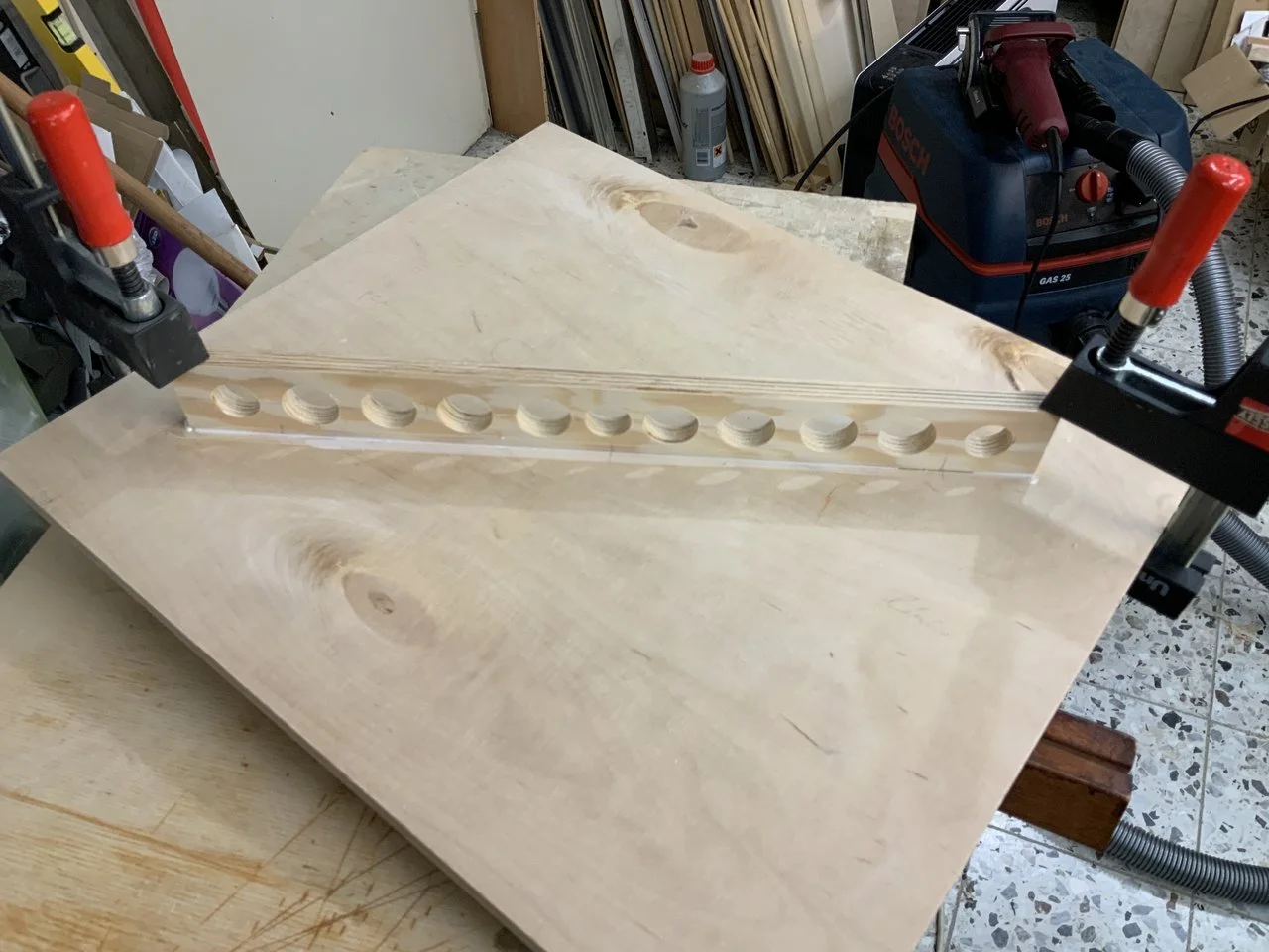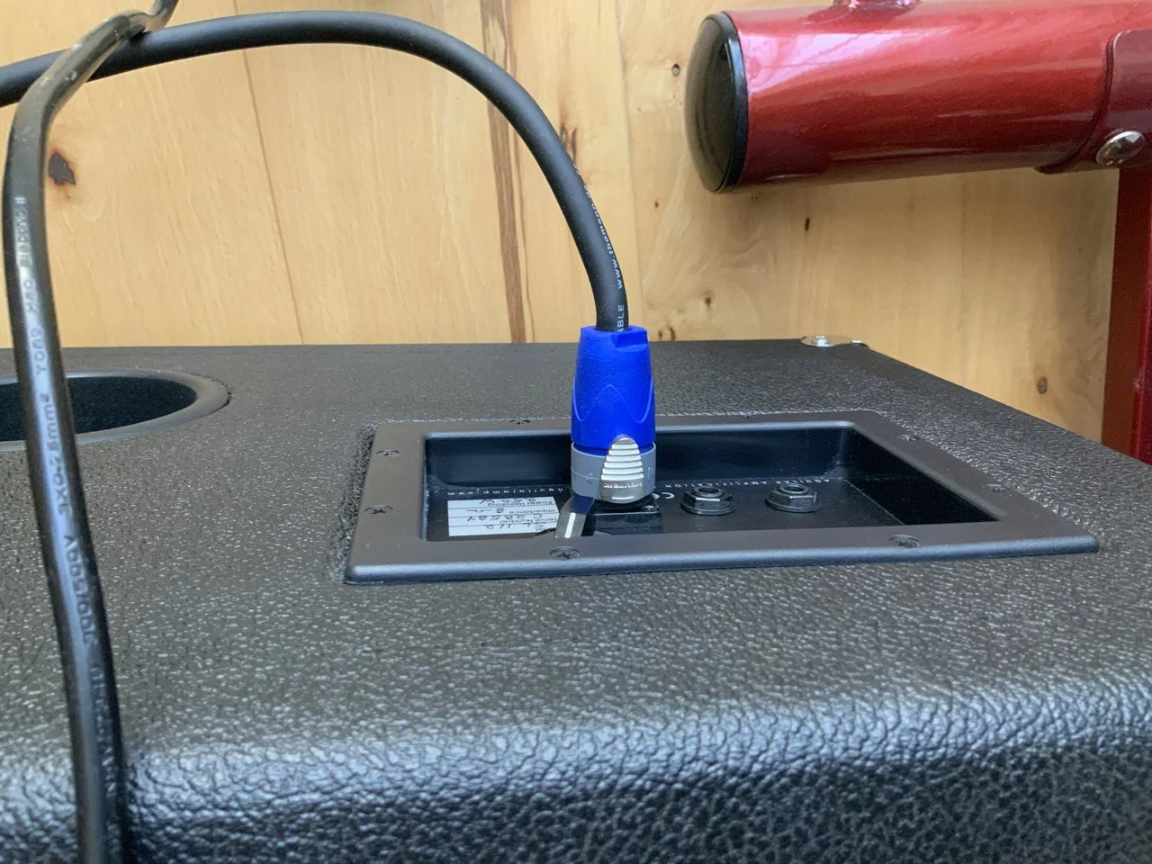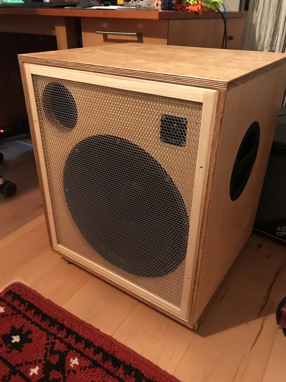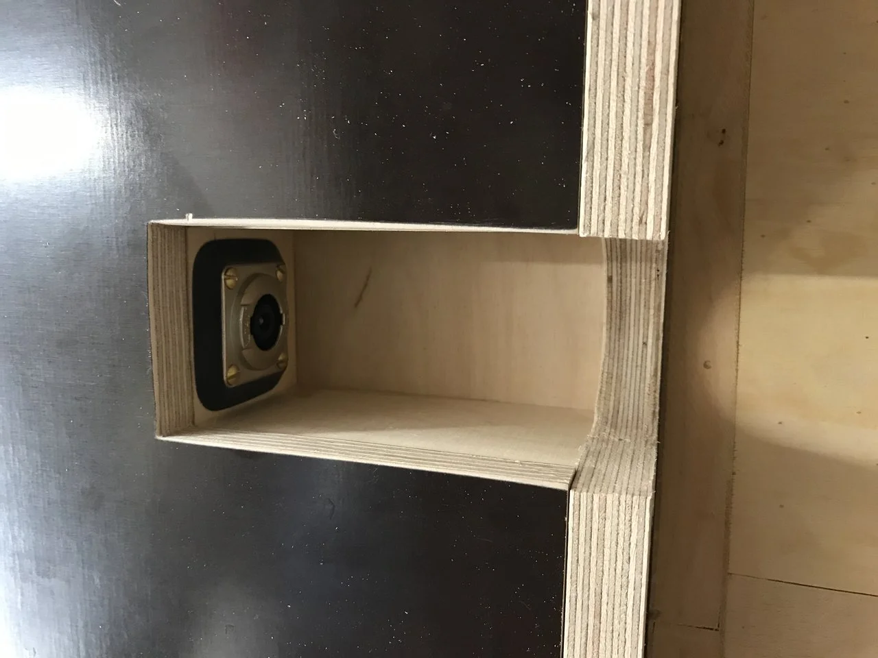 Meintest Du das mit den Löchern in der Leiste? Das ist eine Schichtholz-Aussteifung für den Deckel. Ich wollte auf der Box sitzen oder stehen können, so haltbar sollte die schon sein. Bei 15 mm Wandstärke kommt die sonst auch zu leicht ins Schwingen. Alle 15er Wände bis auf den Boden (gut 17 mm Wandstärke) sind mit solchen Aussteifungen versehen. Die im Deckel war so hochformatig, dass ich Löcher hineingebohrt habe, um das Gewicht zu reduzieren, und Innenvolumen kostet es so auch weniger. Ich wollte die 110 Liter nicht unterschreiten. Jeder zusätzliche Einbau, auch das Chassis selbst, jede Leiste nimmt ja Luftvolumen weg. Das muss man vorher zugeben. Ich hatte ca 4,5 Liter zugegeben und dann hab ich einfach mal meine Leisten und die Anschlussbox auf der Rückseite zusammengerechnet und das Chassis geschätzt. Da war schnell klar, dass ich nicht verschwenderisch damit umgehen darf. Die Bemühungen um das Gewicht waren ok, die Box kommt auf 26 kg, ganz gut bei dem recht massiven Chassis. 15 mm Multiplex sollte man bei der Größe jedenfalls aussteifen, das schwingt sonst merklich. War das Deine Frage?Das rechte Foto verstehe ich nicht, was ist das?