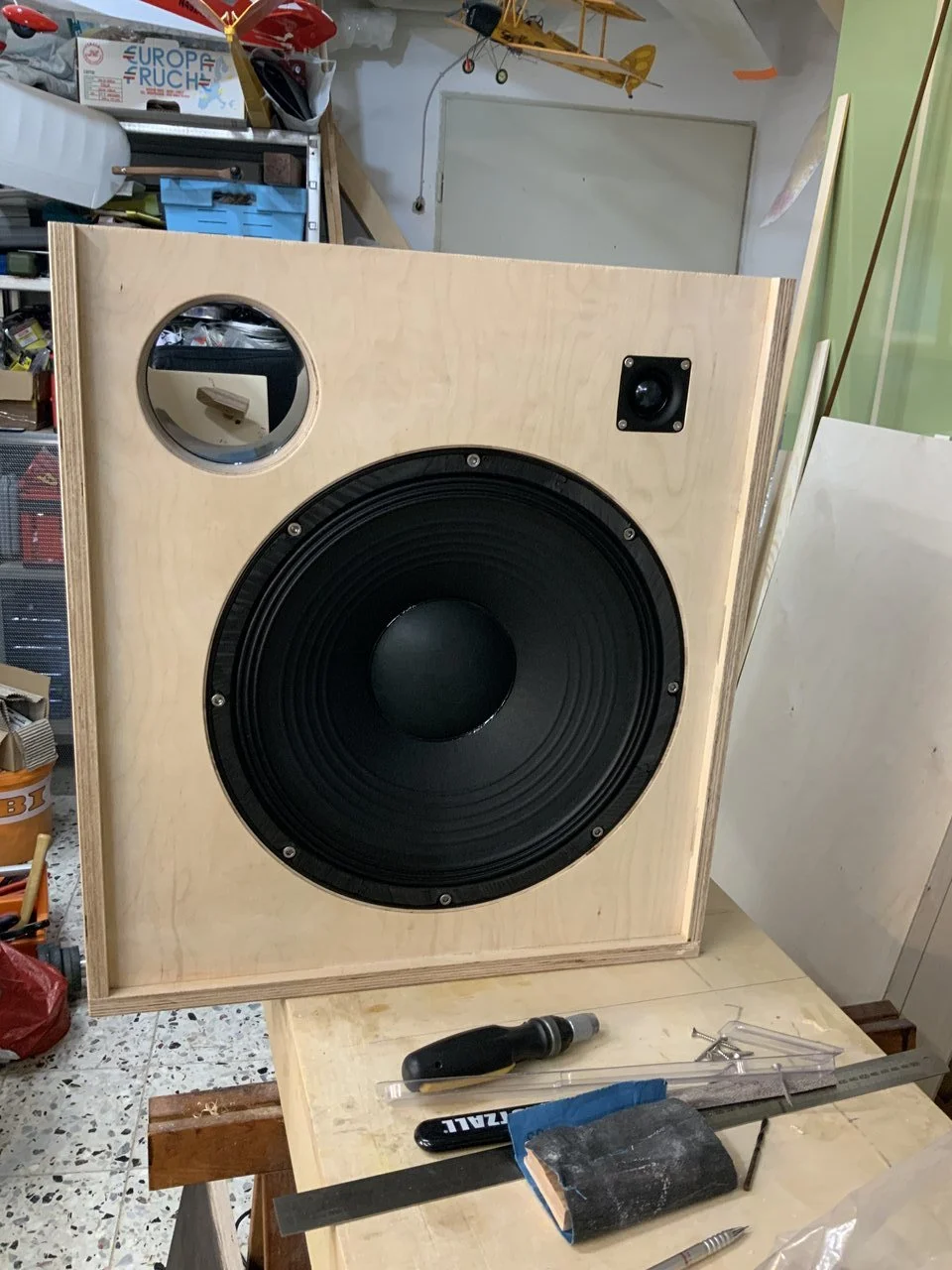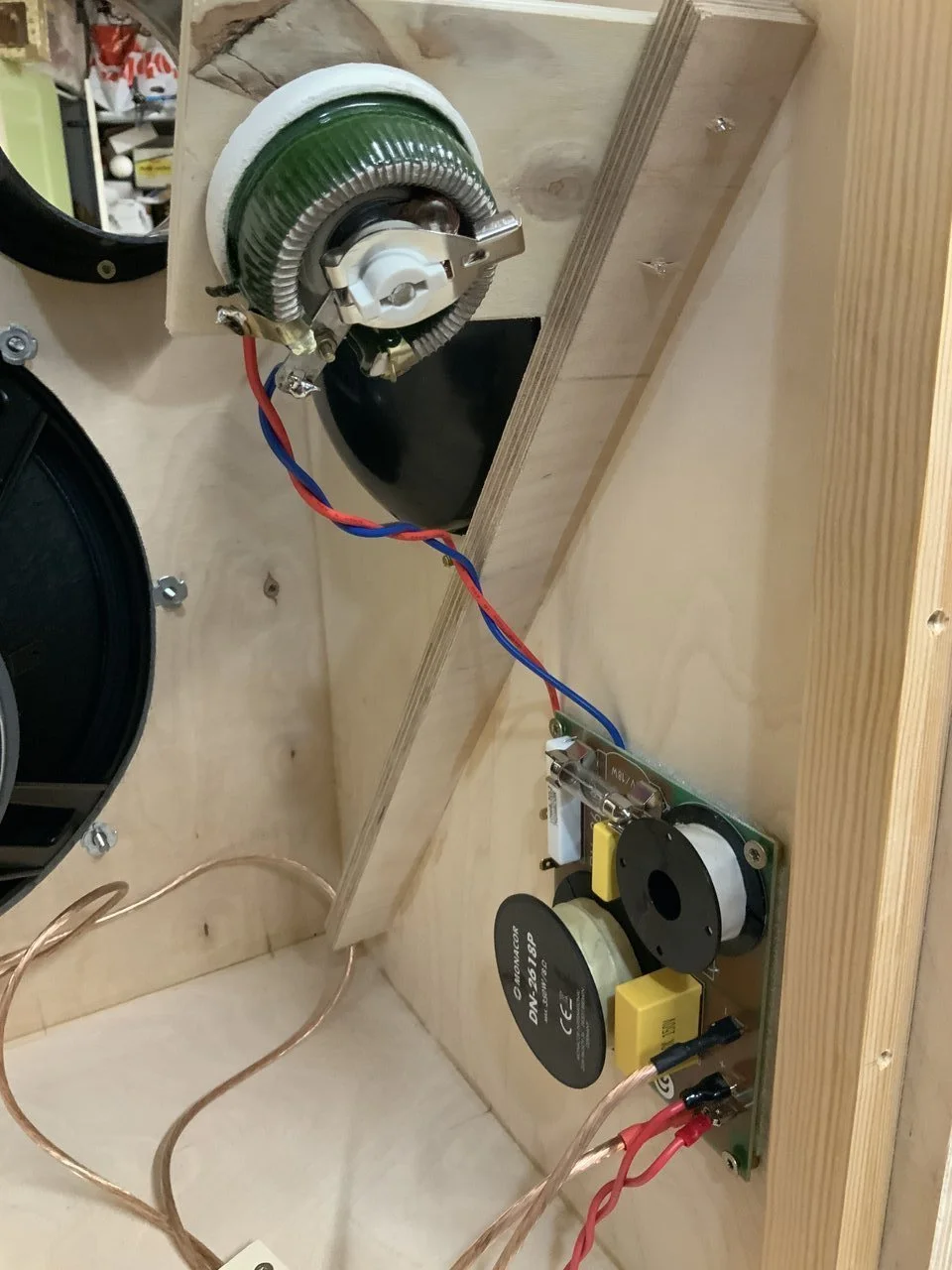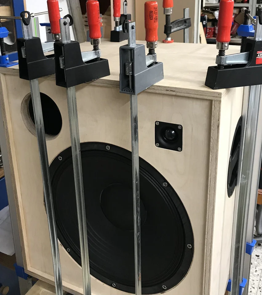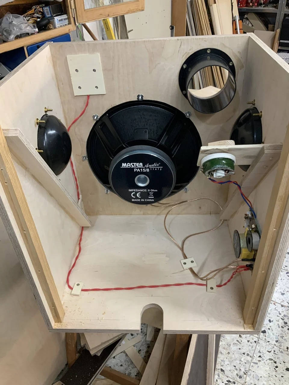 Da hatte aber mal wieder mal jemand Bock in der Werkstatt zu arbeiten ...So ging das von Wochenende zu Wochenende. Es kamen noch eine Weiche und eine Monacor-Kalotte mit 28 mm Durchmesser hinzu. Tweeter regelbar und ein Killswitch für denselben sowie eine Klinkenbuchse parallel zum Speakon sind auch noch hinzugekommen.