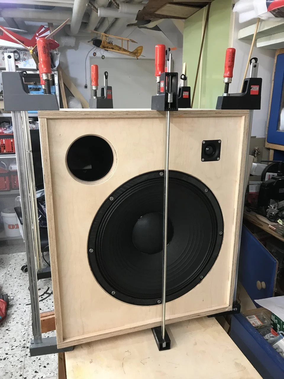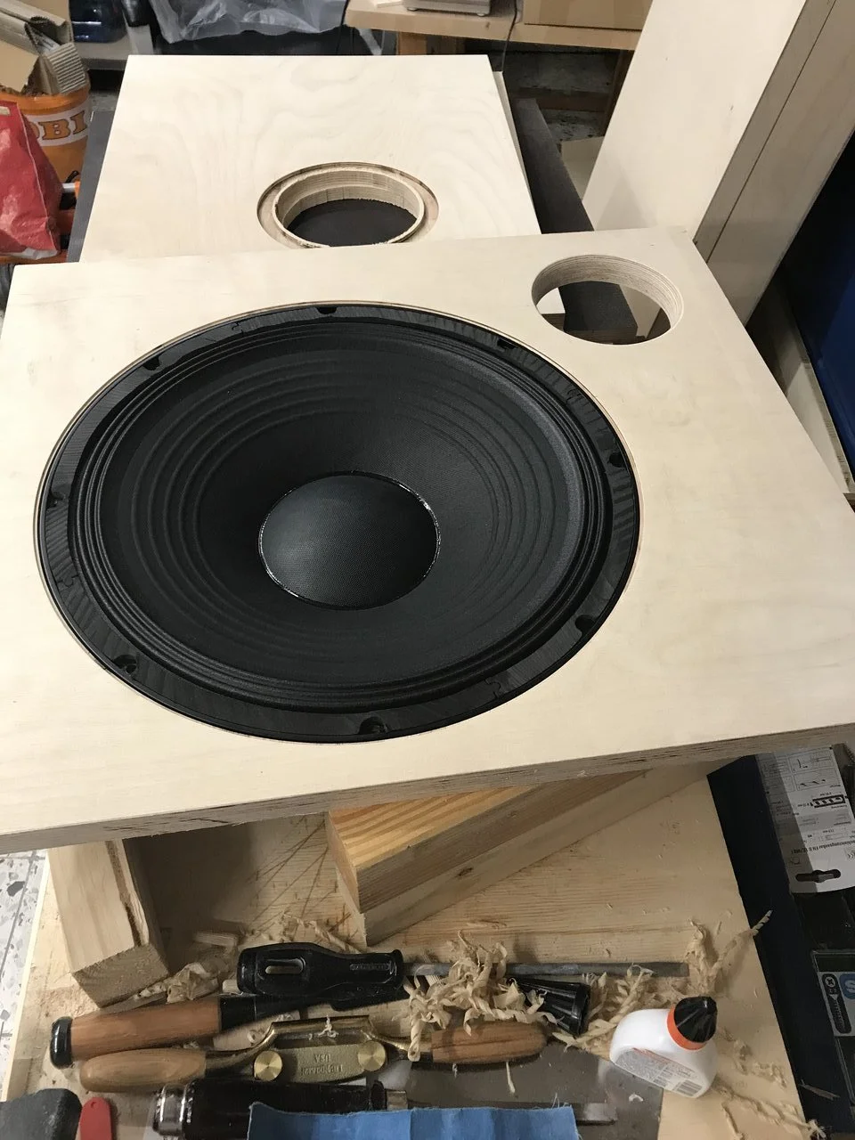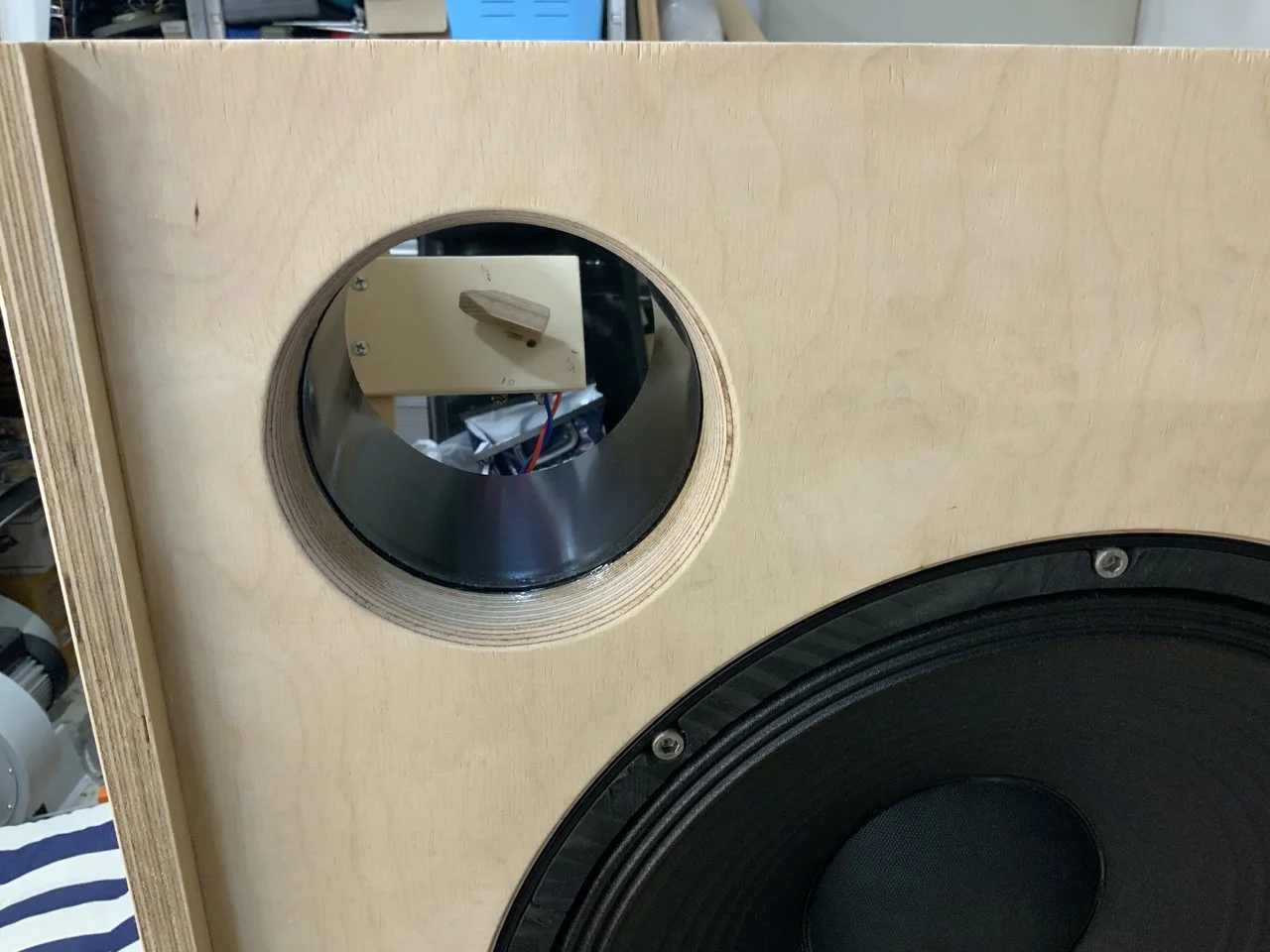 Da hatte aber mal wieder mal jemand Bock in der Werkstatt zu arbeiten ...So ging das von Wochenende zu Wochenende. Es kamen noch eine Weiche und eine Monacor-Kalotte mit 28 mm Durchmesser hinzu. Tweeter regelbar und ein Killswitch für denselben sowie eine Klinkenbuchse parallel zum Speakon sind auch noch hinzugekommen.