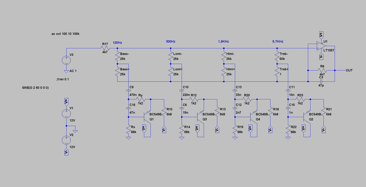 In der Simulation der Gesamtschaltung zeigen sich etwas andere Eigenschaften, als wenn man jedes Filter einzeln berechnen würde... Oberhalb der "Potis" stehen die Frequenzen, die ich aus der Schaltung ermittelt habe. Den Simulationsjunkies unter Euch kann ich gerne die .asc-Datei zur Verfügung stellen.