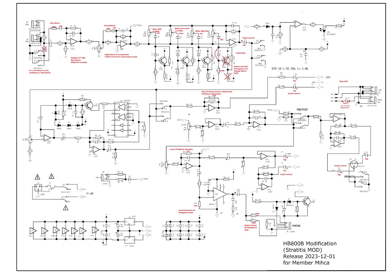 Ich steh jetzt auch vor der Frage, welche der Mods von Stratitis ich laut Stückliste und Beschreibung am MK2 durchführen kann, ohne nachher darüber nachdenken zu müssen, ob ich die richtige Idee falsch ungesetzt oder eine inzwischen falsche Idee richtig umgesetzt habe...Ich habe alles für die preamp-relevanten mods überprüft, siehe auch Zeichnung weiter oben. Angaben natürlich ohne Gewähr. Ich bin sehr happy mit dem teil, vor allem die Anpassung des treble Eq Punkts für den MK2 (Vorsicht, andere Werte als beim 1er) hat bei mir den Unterschied zwischen "okay" und "tut genau was ich will" gemacht.
