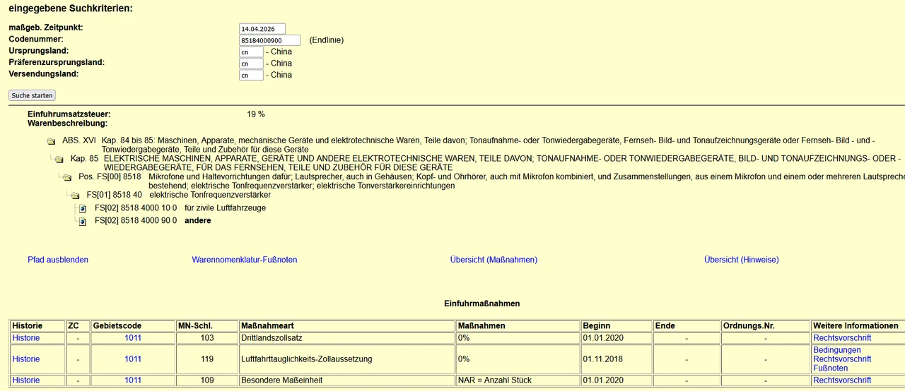 in dem Fall 19% Einfuhrumsatzsteuer auf Kaufpreis und Versandkosten. Die ZTN für Instrumentenverstärker aus CN ist nach meinem Verständnis zollfreiDumme Frage eines unerfahrenen: wenn man da bestellen würde, dann kämen auf den Preis noch Steuern und Zoll Gebühren drauf, oder?