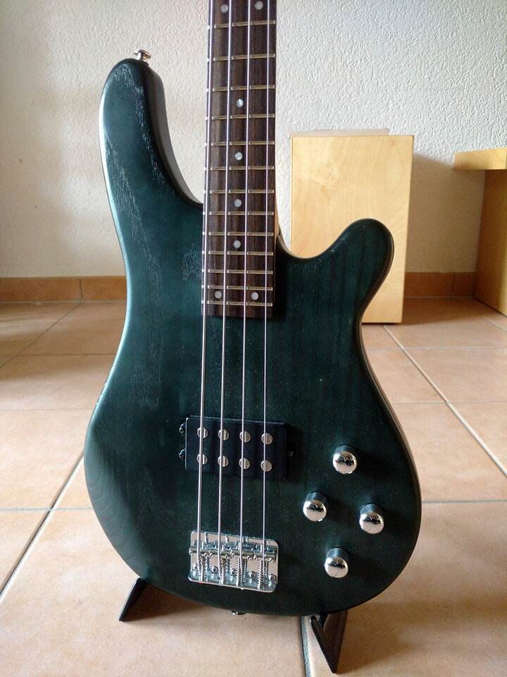 vorstellung. Aber ich gönn jedem sein Plaisirchen.Danke Flex Bass...hat mich beeindruckt und ist ein gutes Beispiel dafür, dass "Schein & Sein" extrem weit auseinanderliegen können. Da versteht jeder Anfänger, dass er sich nicht von einem blendendem visuellen Auftritt täuschen lassen soll.Ein J&D 200 MM TBK, ein günstiger Aktivbass aus Sumpfesche in "Transblack" – was eher Grün war. Die Saitenlage, bzw. der Fretbuzz war nicht zu bändigen. Der Hals hatte an der Verschraubung eine Rampe und noch weitere Stellen an denen es ratterte, also habe ich ihn abgerichtet. Es hat nichts geholfen – neu besaitet und gestimmt trat wieder Fretbuzz auf. Als ich die Saiten wieder abnahm, um ihn für eine weitere Bearbeitung gerade auszurichten fiel mir auf, dass sich der Hals ungleichmäßig krümmte beim Einsatz der Trussrod und zwar oben an der Kopfplatte deutlich stärker als unten. Da der Bass auch klanglich keine Ohrenweide war durfte er für ein Taschengeld weiterziehen ...