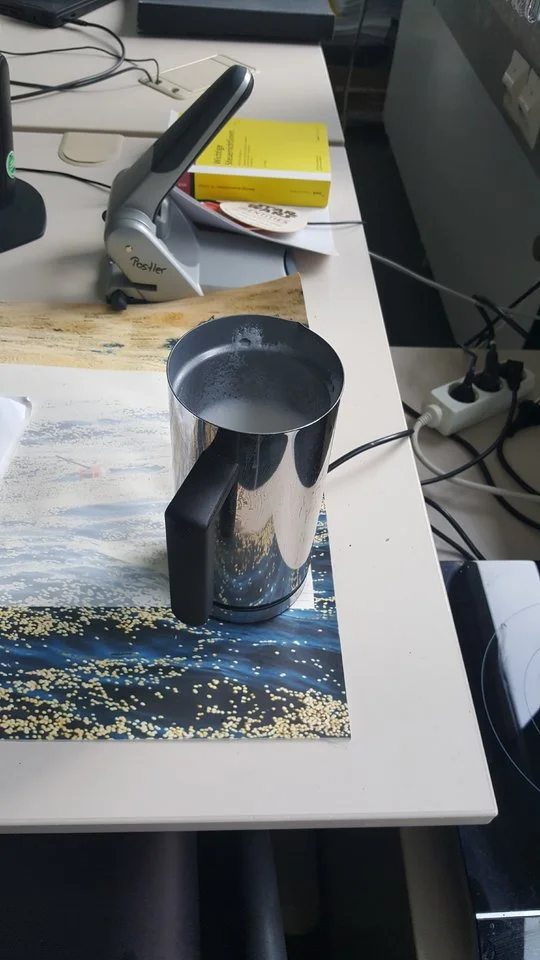 Fürs das Aufschäumen der Milch gibts verschiedene Lösungen: Der batteriebetriebenen Milchvibrator für zweieurofuffzich aus dem Supermarkt tuts genauso wie der elektronische Aufschäumer für 35 Euro. Achtet nur darauf, das ihr hier unbeschichtete Kannen nehmt. Ihr solltet die Kannen nach jeder Nutzung sauber machen und da Milch schnell mal unten ein wenig anbrennt, ist es hilfreich da auch mal mit einem Kesselschwamm oder dieser Metallwolle rangehen zu können.