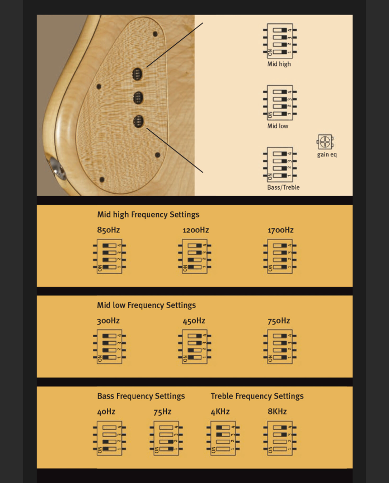 Genau. Es sind dip switches für die Centerfrequenzen.Und die Löcher im E-Fach Deckel sind der Zugang zu Trimmpotis/Schaltern zum Einstellen der Centerfrequenzen?