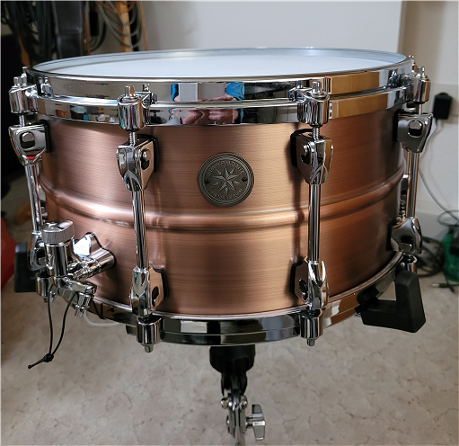 Meine Hauptsnare ist 'ne Acrolite (Alu), und nun will diese hier gar nicht mehr weg vom Kit.. eine Tama 14x7 Starphonic Copper aus Japan.. hab' sie mittelhoch gestimmt.. oh yeah die fetzt, geile Ergänzung![]()