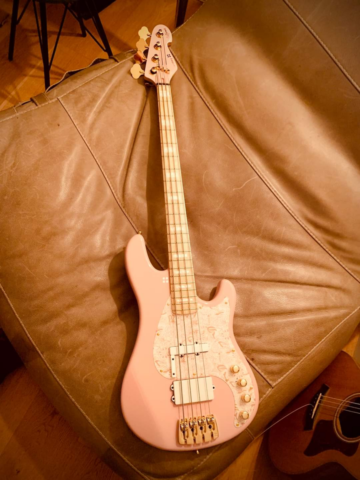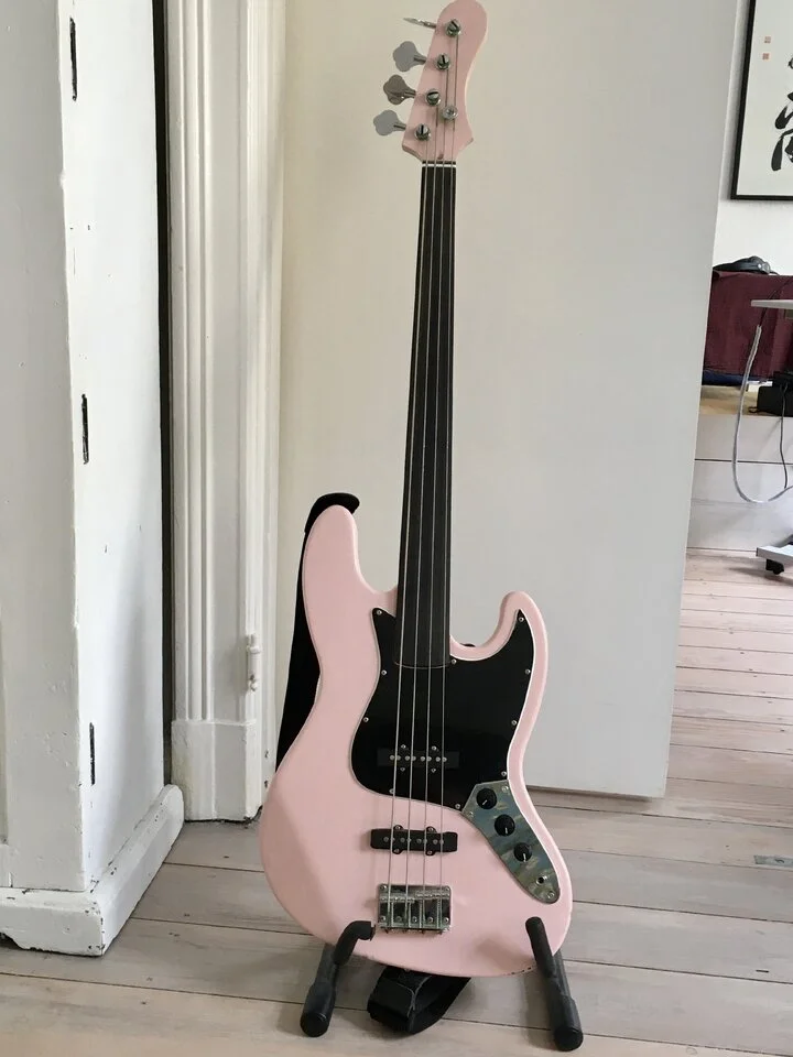Es ist das alte wundersame Spiel: Ein zusammengestückelter Bass (der Fretless-Hals, Precision, vermutlich auch China, passt nicht 100% in die Halstasche, macht aber nix). Das Pink mit der Hand lackiert, vemutlich über Weiß, vermutlich Acryl. Natürliches Vintage! Das Pickguard, ursprünglich weiß, sah gut aus, schwarz aber "männlicher". Allerdings: Das schwatte Pickguard aus der Grabbelkiste passte nicht - der berühmte Millimeter fehlte. Also: Mit einem Rest schwarzer Folie das weiße Pickguard beklebt. Aus einem Meter Entfernung sieht es gut aus – und näher kommen meine Fans ohnehin nicht ran (aus Respäckt!)