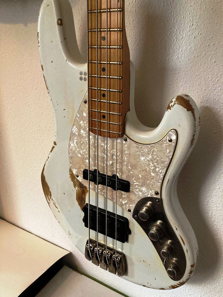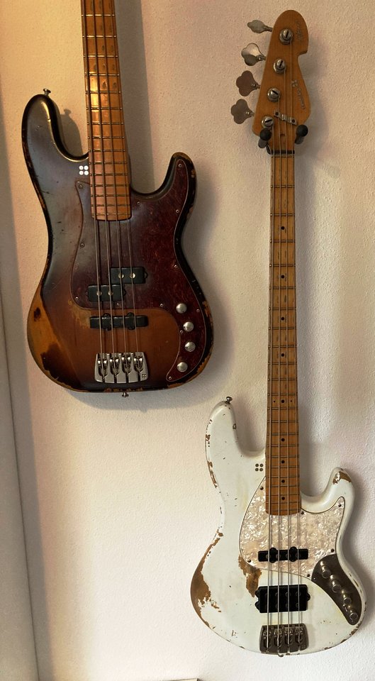 Bisschen Off-Topic da es ja eigentlich um den weißen geht: Sehr schön nebendran einen VT zu sehen. Bevor ich mir meinen Stingray zugelegt hab stand Sandberg gaaaanz weit oben in der Auswahl, allerdings wurde ich mit dem hinteren Humbucker nicht wirklich warm. Da hat mir die P/J-Kombi besser gefallen und hat auf eine eigene Art mehr gedrückt als die MM/P-Kombi (bitte nicht steinigen, bin doch noch so jung...) die man überwiegend findet.