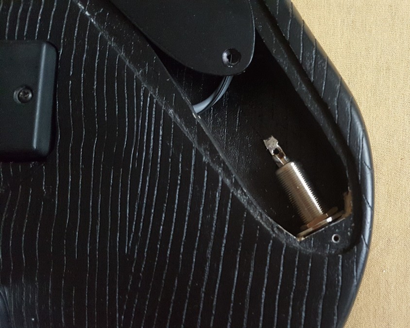 Die Restarbeiten wie Brücke ausrichten, Pickgurad ändern, die Platte für die Potis herstellen sowie ein Loch für die Klinkenbuchse zu bohren waren relativ schnell erledigt. Warum auch immer, ich kam auf die Wahnsinnidee das Pickguard und die Potiplatte bündig mit der Oberfläche haben zu wollen, gedacht, getan, es blieb mir noch meine „Lieblingsarbeit“ schleifen.