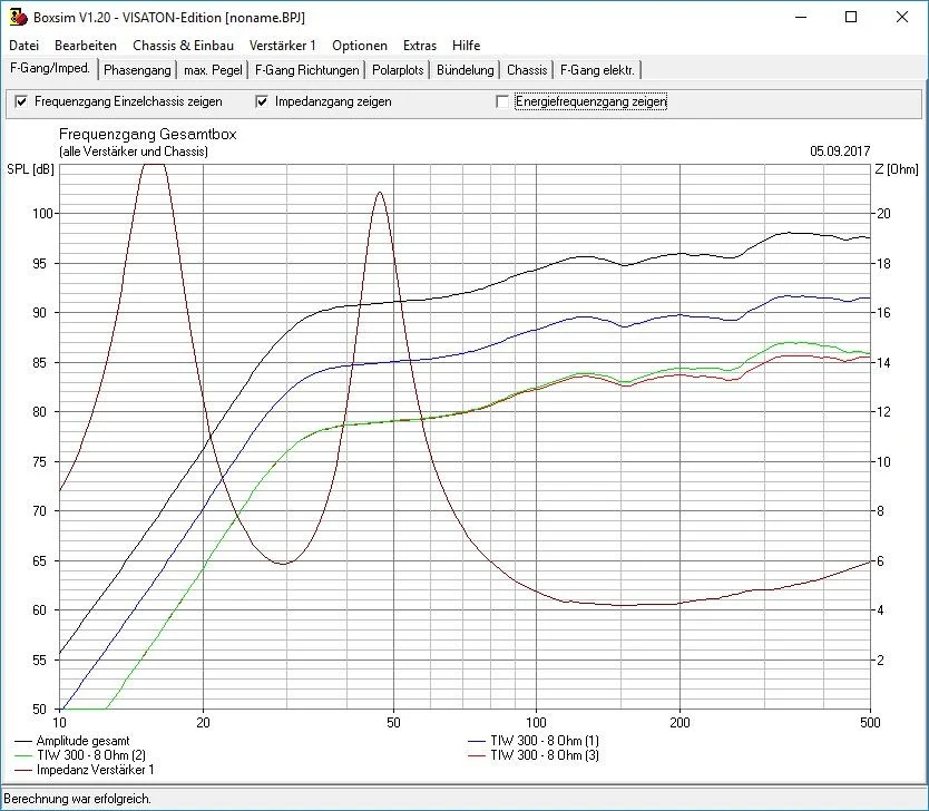 - rote+Grüne Linie sind die seriell geschalteten 12"er, die dann parallel zum blauen hängen. Da an beiden nur die halbe Spannung im Vergleich zum blauen anliegt, ist der einzelne Output 6dB geringer.