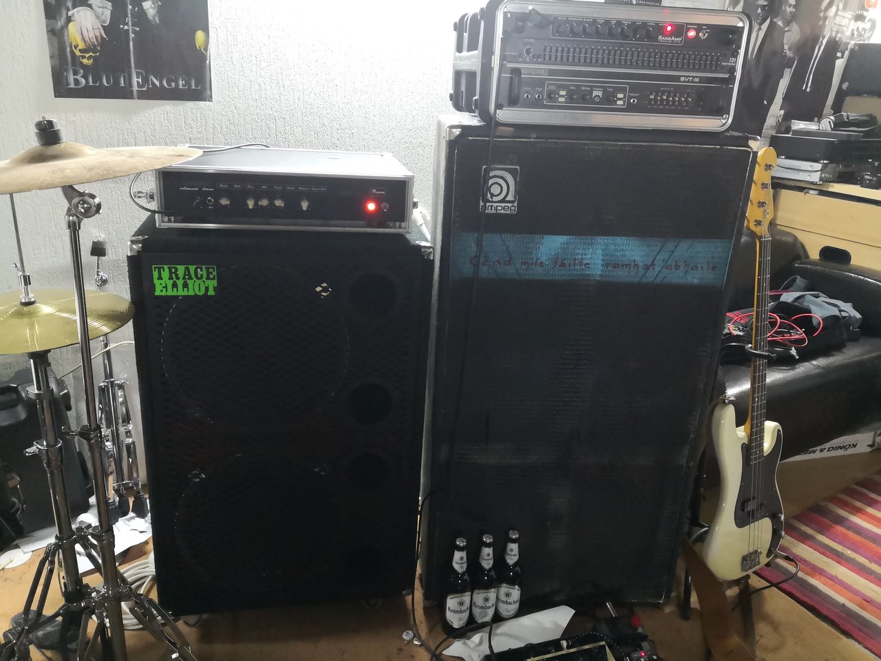 LH1000 mit Custom Frontblende (Danke lieber @rootbert ) auf einer 90er Jahre Trace Elliott 215 mit Oberton 15L400 (Danke lieber @StonerGreg ).