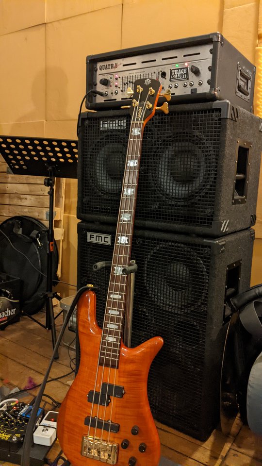 )Die 210 ist eine alte FMC 210 PRO2 L...Sehr geil, wir spielen ja fast das gleiche Setup!Der einzige Unterschied ist, dass bei mir anstelle der 210"er FMC eine 410" Trace Elliot steht und in meinem Spector Bummhucker werkeln statt P/Js...