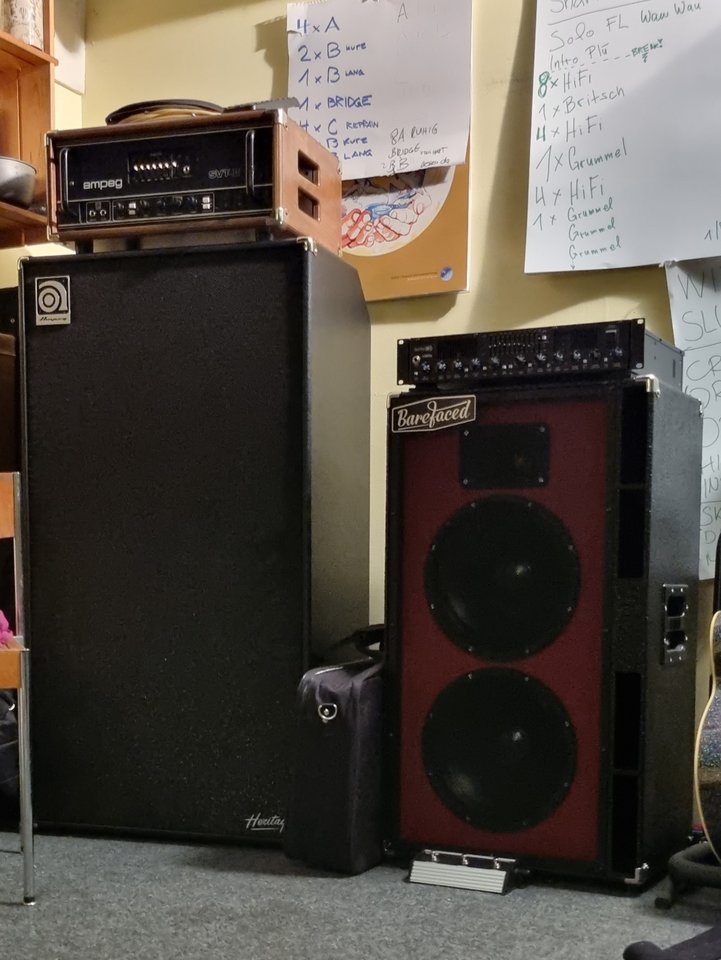 Der SVTII ist zurück von Durchsicht und Reparatur. Neu sind die beiden Secondhand-Kollegen neben dem Ampeg-Turm dazugekommen. Die Big Twin III ist so leicht, da muss ein Gewicht wie der 1200S obendrauf.