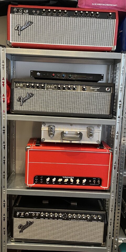 Der G2002 wartet auf Restauration, ganz unten im Case ein Laney Nexus 400, Röhrenendstufe 380W, mit Fussschalter.