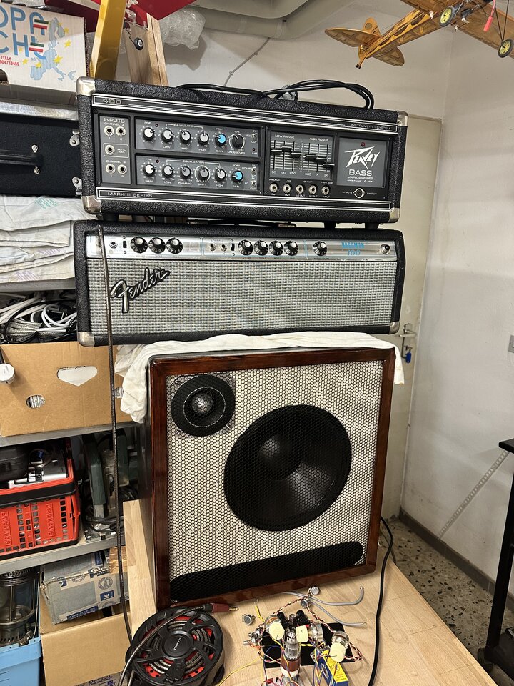 Das war in meinem Bastelkeller nach Fertigstellung des Amps auf meiner selbst gebauten 1x12 plus HT, und dem 100W Bassman. Anhang anzeigen 848896