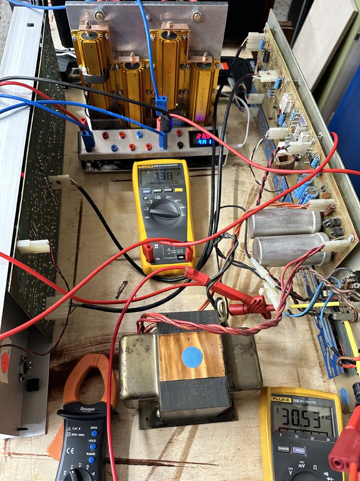 Die Werte sind an der Last, ich brauchte nicht einmal die Elkos tauschen. 30 V rms, 7,38 A rms bei 60 Hz Sinus aus dem Generator eingestellt, so dass die Clipping-LED am Frontpanel gerade nicht anging.