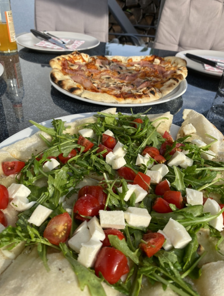 Vorne im Bild ist noch Knoblauchbrot, Flammkuchen funktioniert auch toll. Also wer das oft macht und für mehrere Leute, zumindest testen!