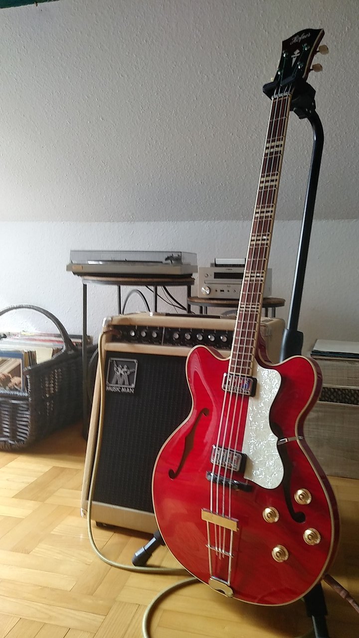 Da ich in letzter Zeit Bedarf an roten Bässen habe, ist jetzt ein Verythin bei mir im Bestand. Macht richtig was her. Das Pickguard könnte wertiger sein, ebenso die Potiknöppe. Die F-Löcher noch mit Bindings und der Look wäre perfekt.