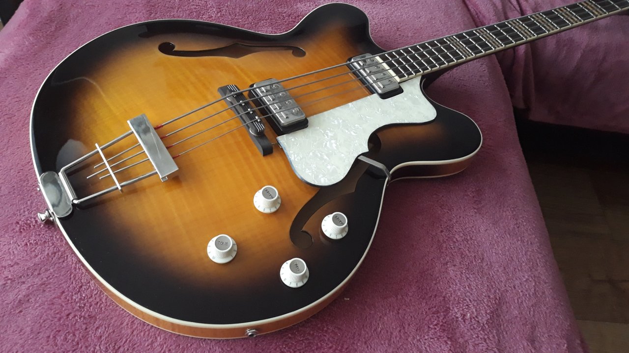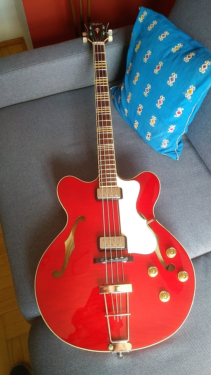 Interessantes Teil! Ein reguläres Höfner Modell ist es jedenfalls nicht. So richtig nach Höfner sieht mir eigentlich nur der Hals aus, den Body hätte ich eher Framus zugeordnet, allein schon wegen der Jaguar-Korpusform. Es gab da mal den Junior 4 Bass, der ziemlich genau diese Pickguard- und Pickup-Anordnung hatte, die vom Fender Musicmaster Bass abgeschaut war (der bei Fender allerdings mit Mustang-body daherkam). Dieses rote Sunburst gabs sogar auch bei Framus, zumindest bei den frühen Strato Modellen.Mein Höfner Bass.