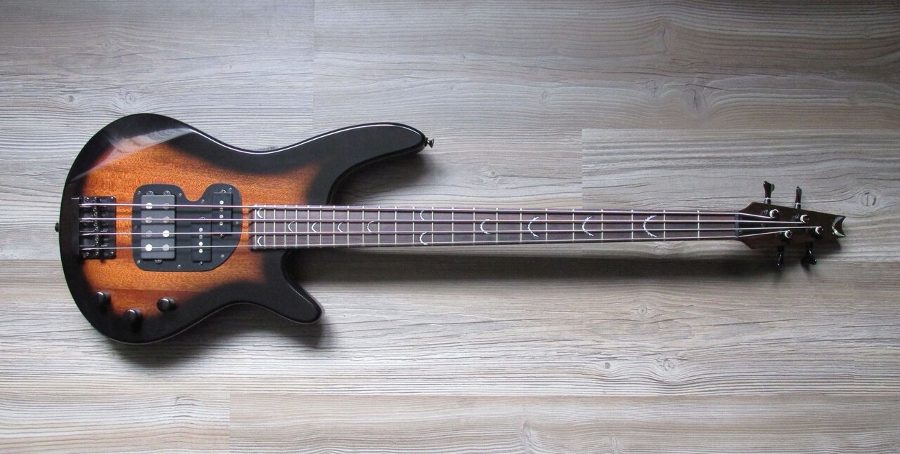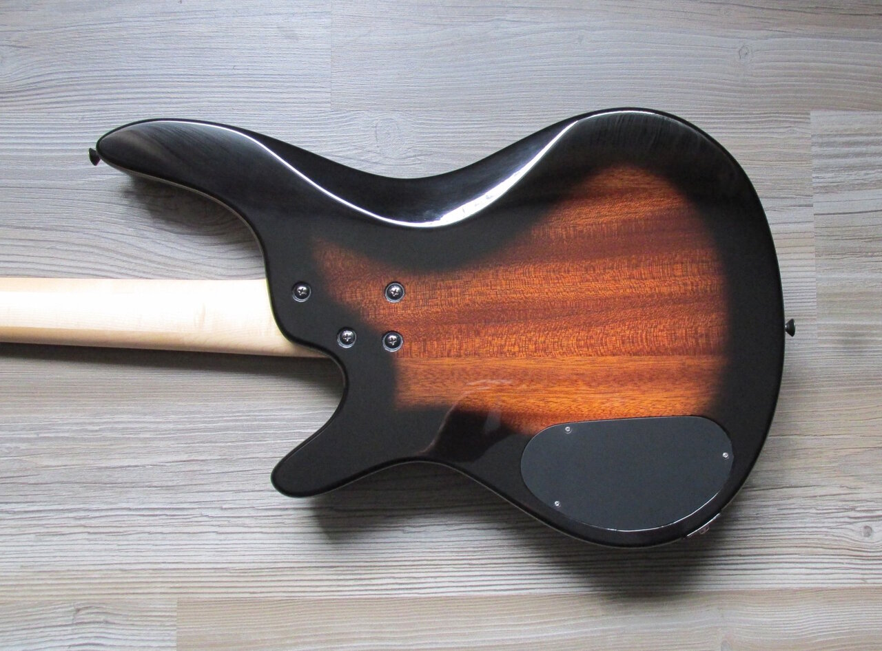 So erging es mir inzwischen mit der Spraydosen-Burst-Lackierung vom neuen selbstgebauten Korpus für meinen Dean-Bass (obiger Beitrag #117). Also habe ich mir nochmal die Mühe gemacht und den alten Lack abgeschliffen und alles neu lackiert. Erstmal wurde der Korpus mit 'ner Lackierpistole mehrmals mit Klarlack lackiert, selbstverständlich wurde zwischen den Durchgängen der Lack nach dem Trocknen zwischengeschliffen und dann der schwarze Rand mit 'ner Airbrushpistole aufgetragen. Gleich nachdem der schwarze Lack drauf war wurden sofort mehrere Schichten Klarlack aufgetragen. Okay, ich muss zugeben, dass ich das zweimal durchziehen durfte, weil ich beim ersten Versuch den Klarlack zu dünn aufgetragen hatte und deswegen beim Nassschliff den schwarzen Lack weggeschliffen hatte, so dass das Holz wieder zu sehen war.