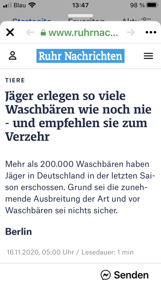 Dann essen wir halt Katzen... Schmeckt man eh nicht, so in süß-saurer Soße...Naturschutzorganisationen ordnen den Waschbären mittlerweile als "einheimisches Waldtier" ein. Der Waschbär füge sich harmonisch ein, sei für keine größeren Schäden verantwortlich und vertränge keine angestammten Tierarten.