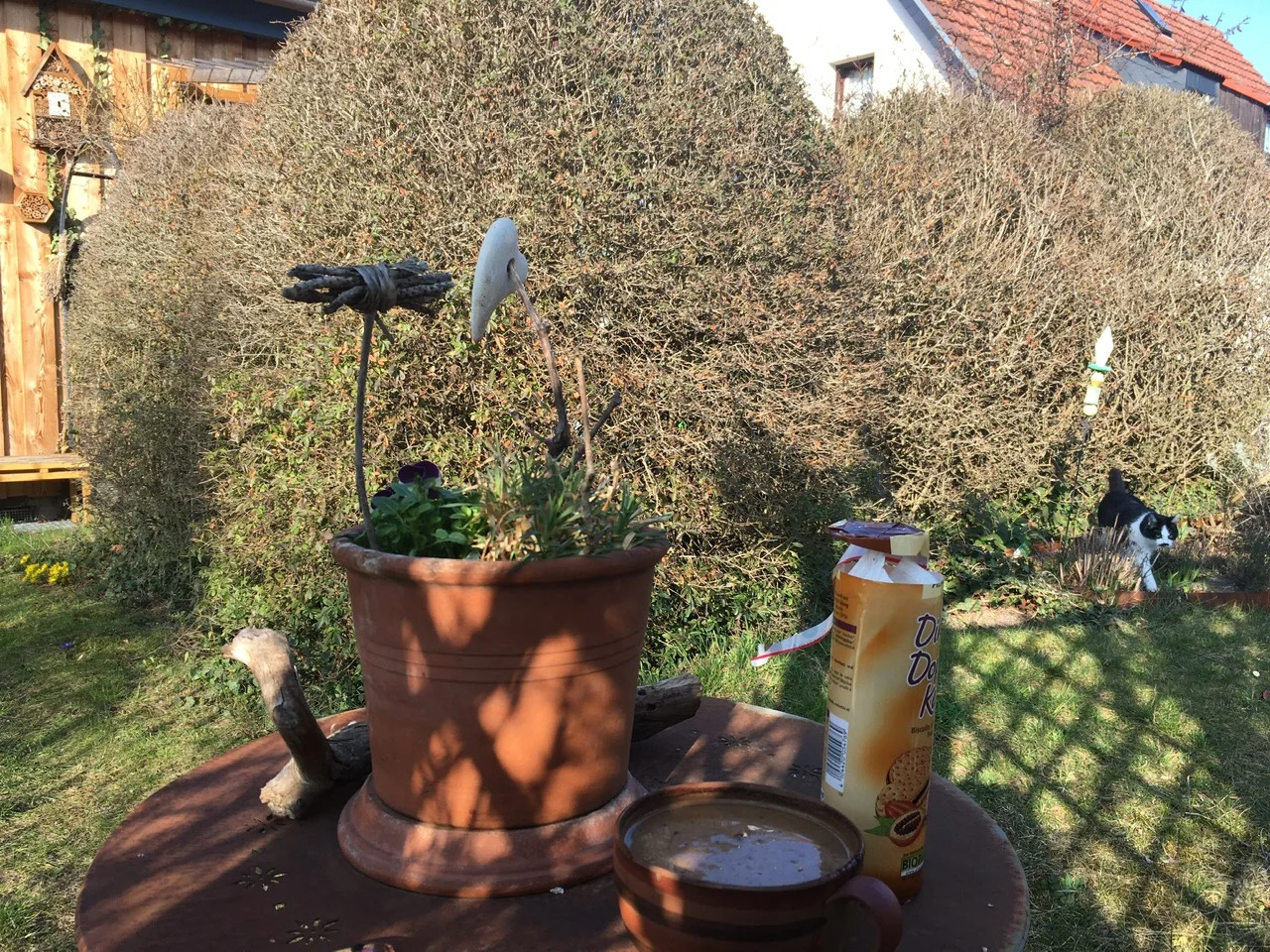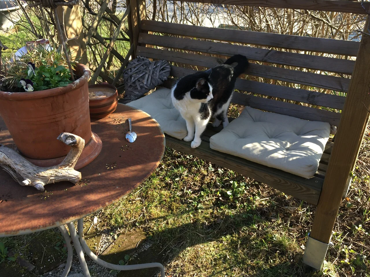 erst mal die Bank wischen, Sitzkissen aufschütteln, Tisch wieder richtig hinstellen