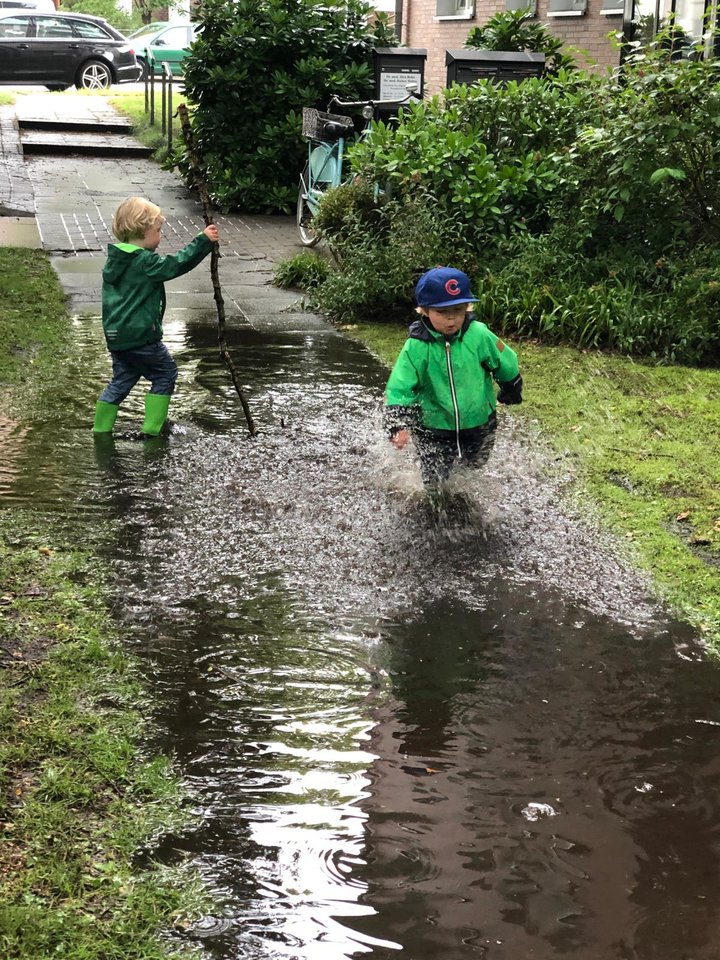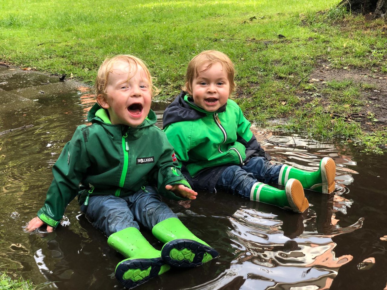 Friesennerz + Südwester + Gummistiefel und dann im Regen in die Pfützen gesprungen.