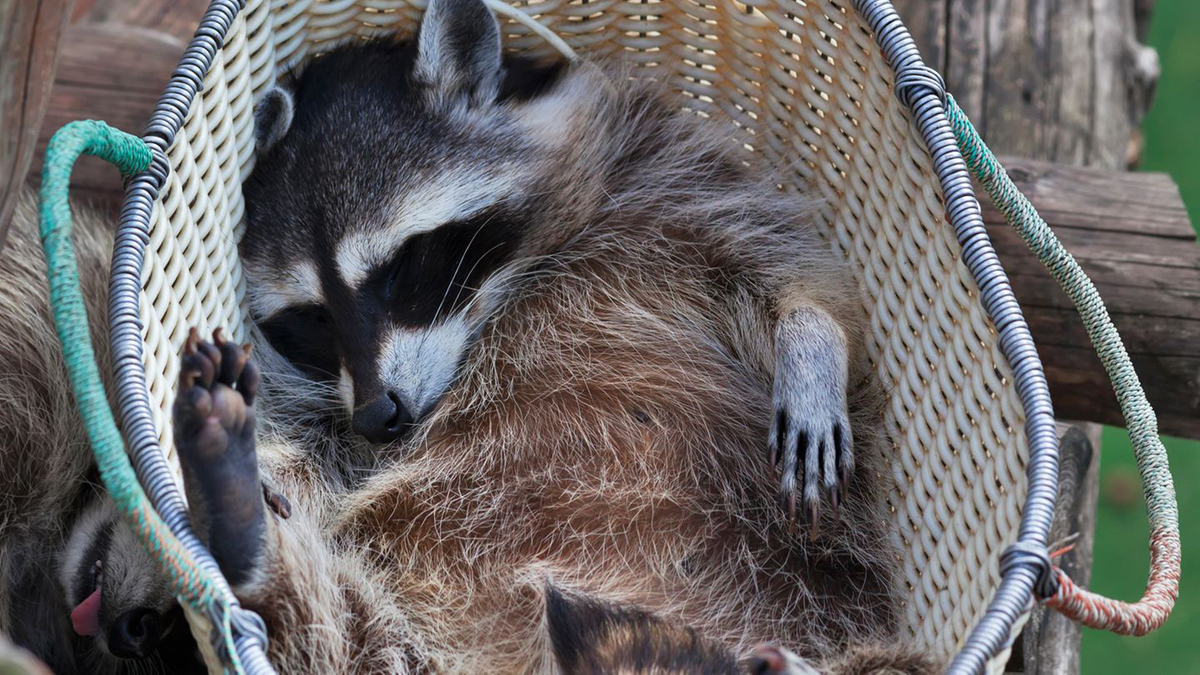 Moa... *gähn*...Ich hab den Herrn Waschbären heimlich beim Poofen in seiner "Kiste" fotografiert. Ungalanterweise lässt er seine weibliche Begleiterin außerhalb schlafen (links am Bildrand).![]()
