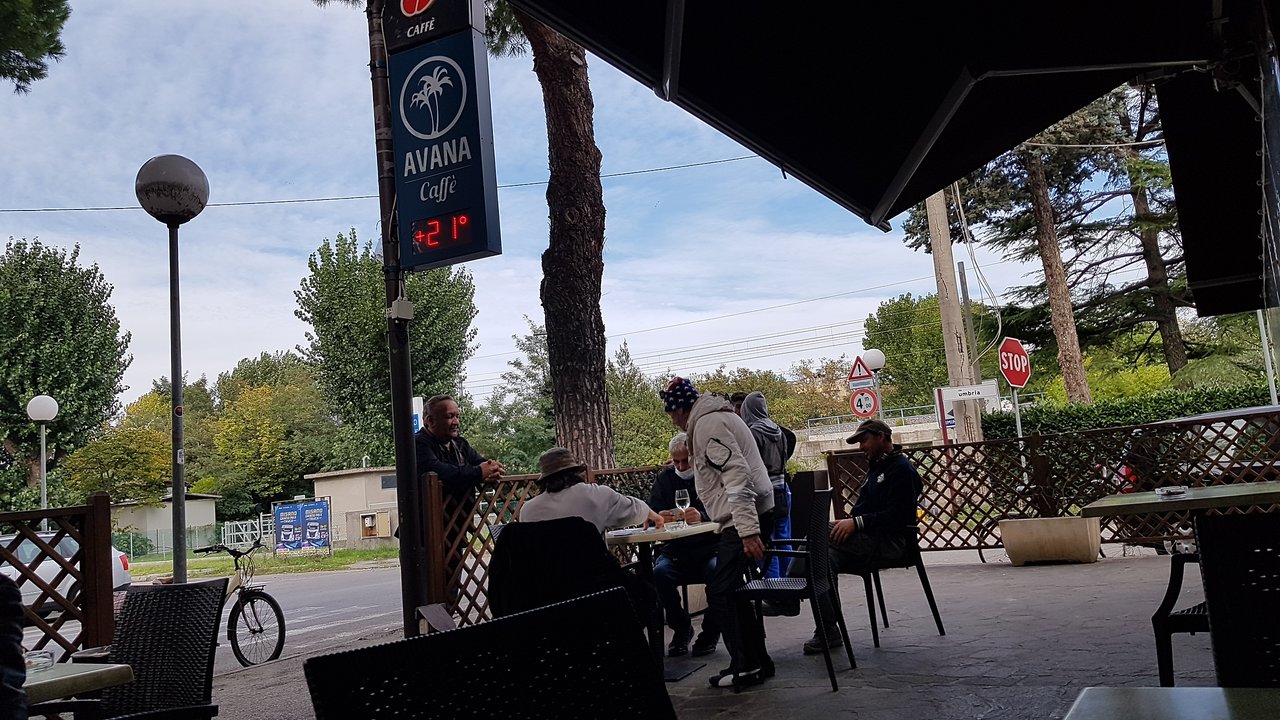 Wenn die Anzeige stimmt, herrschen da mollige 21 Grad Plus. Und dafür sind die Herren schon ziemlich warm eingemummelt.Moin live aus der Beiz