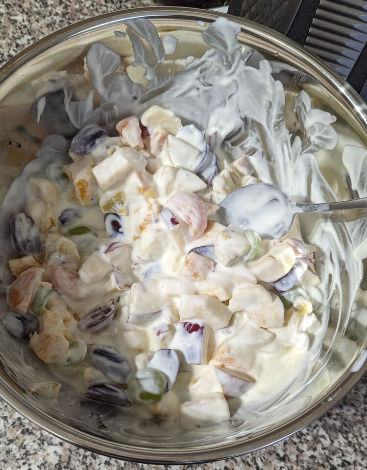 Gelbe Kiwi, grüne Kiwi, Orange, Mandarine, Apfel Boskop, Birne, Banane, Trauben, rot und grün, alles in Naturjoghurt...![]()