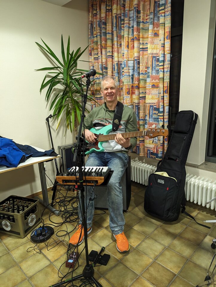 Guuude zusammenZurück aus dem sehr produktiven Probenwochenende starte ich müde, aber zufrieden in die neue Woche (trotz Mistwetters). Hier das Setup des Arbeitsplatzes vom Wochenende..... (für das wichtige Utensil unten links unterm Tisch war nicht zuständig. Das Bier-Gear hätte ich so nie eingepackt. Warsteiner ist nicht meins....)