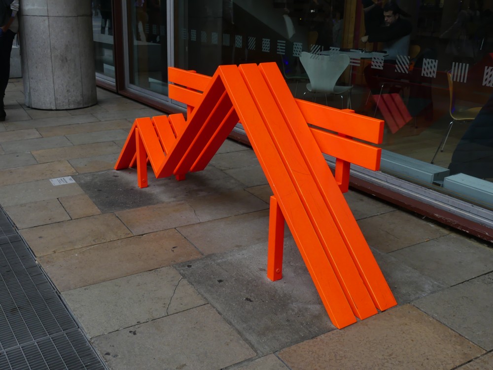 Das ist keine Parkbank, sondern eine innerstädtische Minogolfbahn. Modell Zick-Zack-mit-intergriertem-Fensterscheibenschutz.