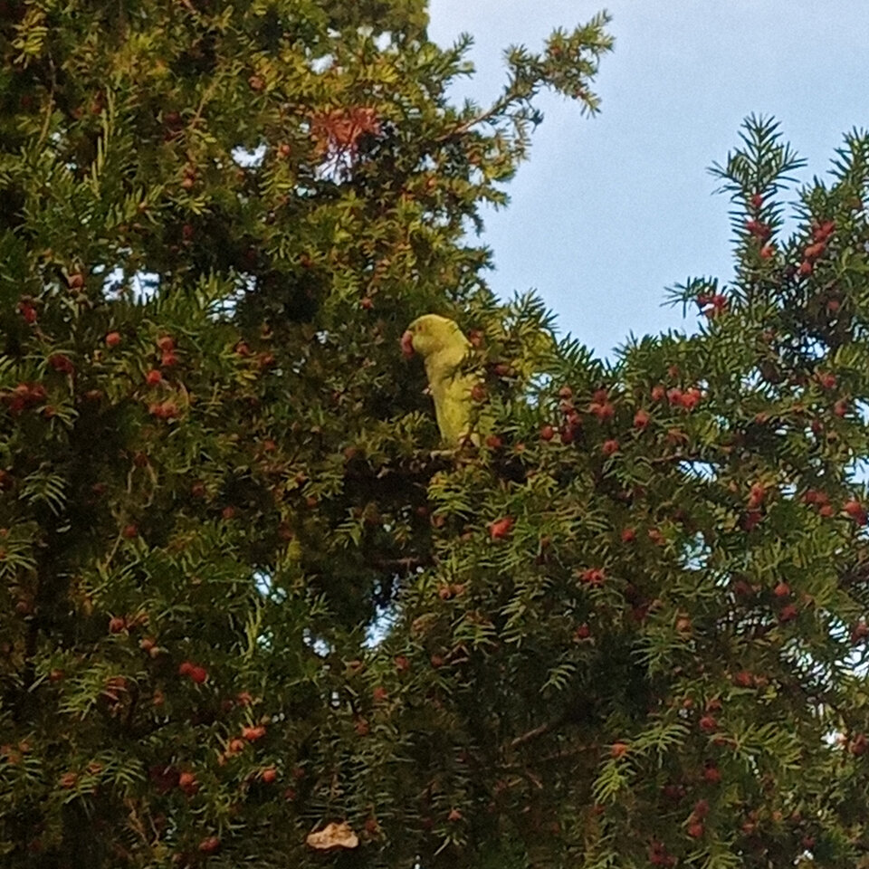 Bei meinem Spaziergang vorhin habe ich diesen Papagei fotografiert. Er war aber nicht der einzige im Baum. Da waren sicher ein Dutzend seiner Kollegen und haben sich die Wampe an den Früchten vollgefressen. Diese Papageien leben zu Tausenden hier in der Gegend. Es sind 2 Arten: Alexandersittiche und Halsbandsittiche. Das hier muss ein Halsbandsittich sein. Die machen mit ihrem Gekreische auch einen Heidenlärm. Aber ich mag diese putzigen Viecher.