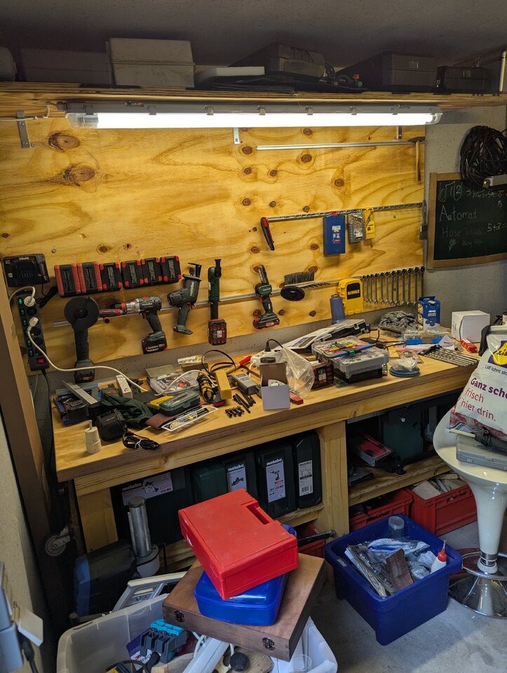Spontan würde ich sagen: Ein paar Steckdosen zu wenig und ein paar Akkus zu viel.Jo, so sieht's im Moment aus. Jetzt heißt es Werkzeug sortieren und aufräumen ... dann kann ich anfangen, Projekte zu beginnen: