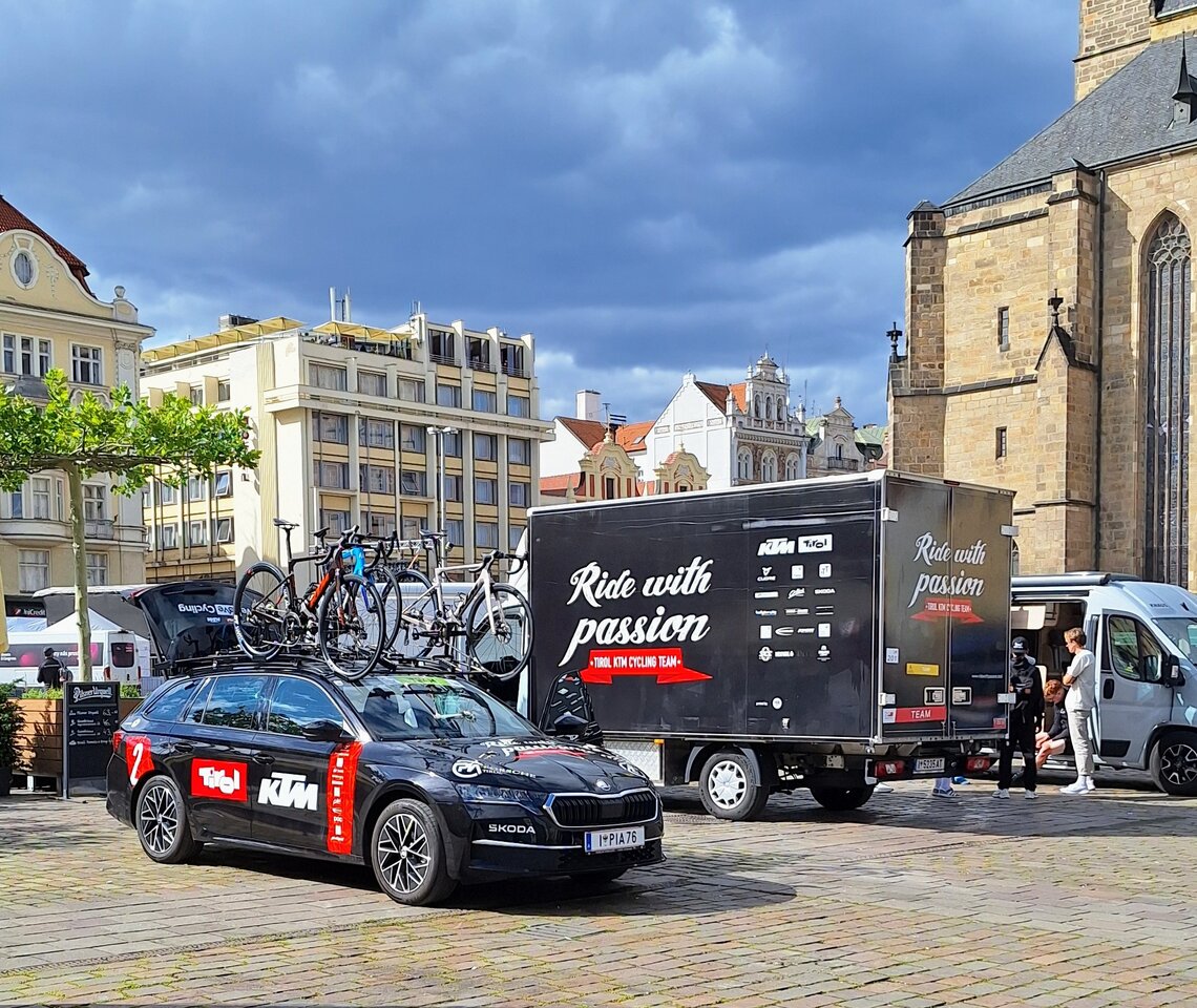Die Rennräder waren heute auch in der Stadt. Es wurde irgendeine Rundfahrt in Pilsen beendet