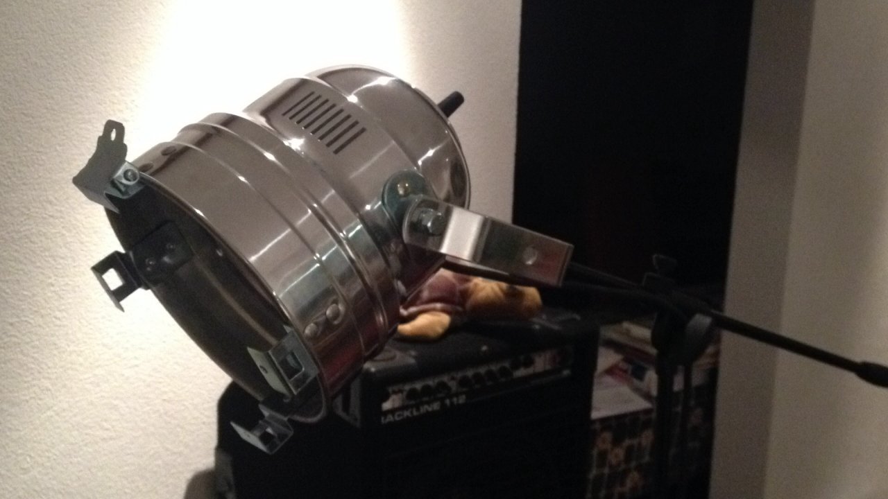 Ne Kanne, nen Mikrofonständer dazu, 5 Meter elektrische Schnur mit Stecker dran, so ne neumodische JEDI iDual LED-Funtzel für innerinn, mit Faaabwechsel und zig Programme