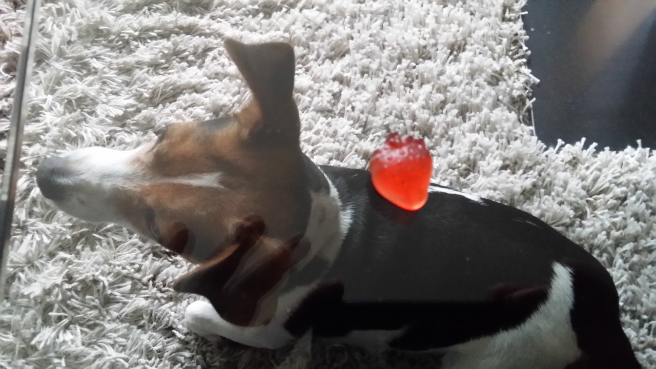 Hast du eine Gummierdbeere auf den armen Hund geklebt?
