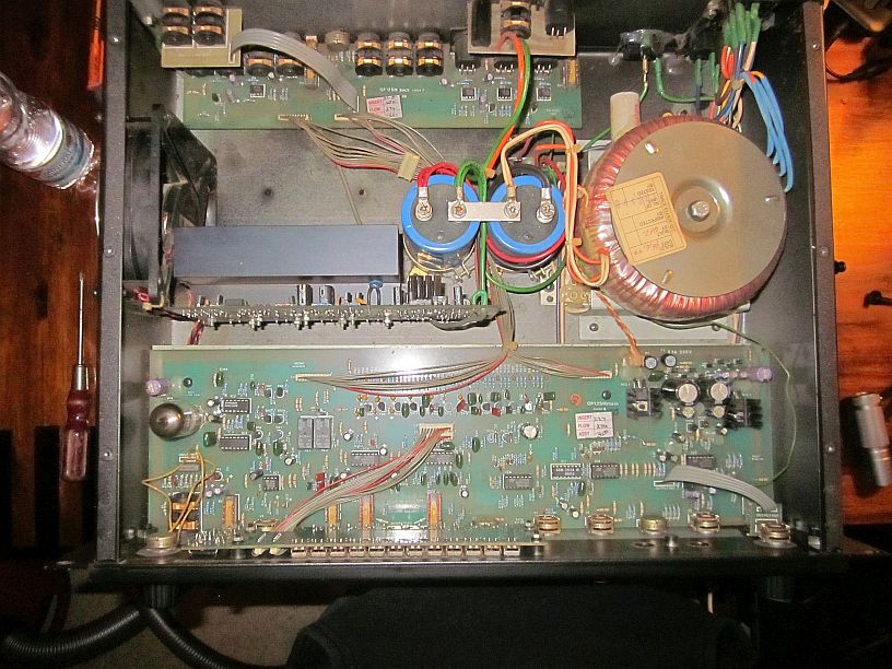 , aber der Rest ist gleich, die Vorstufe mit Klangreglung, die Endstufe links, wahrscheinlich mit 6 Transen drauf, die dicken Elkos, Basst