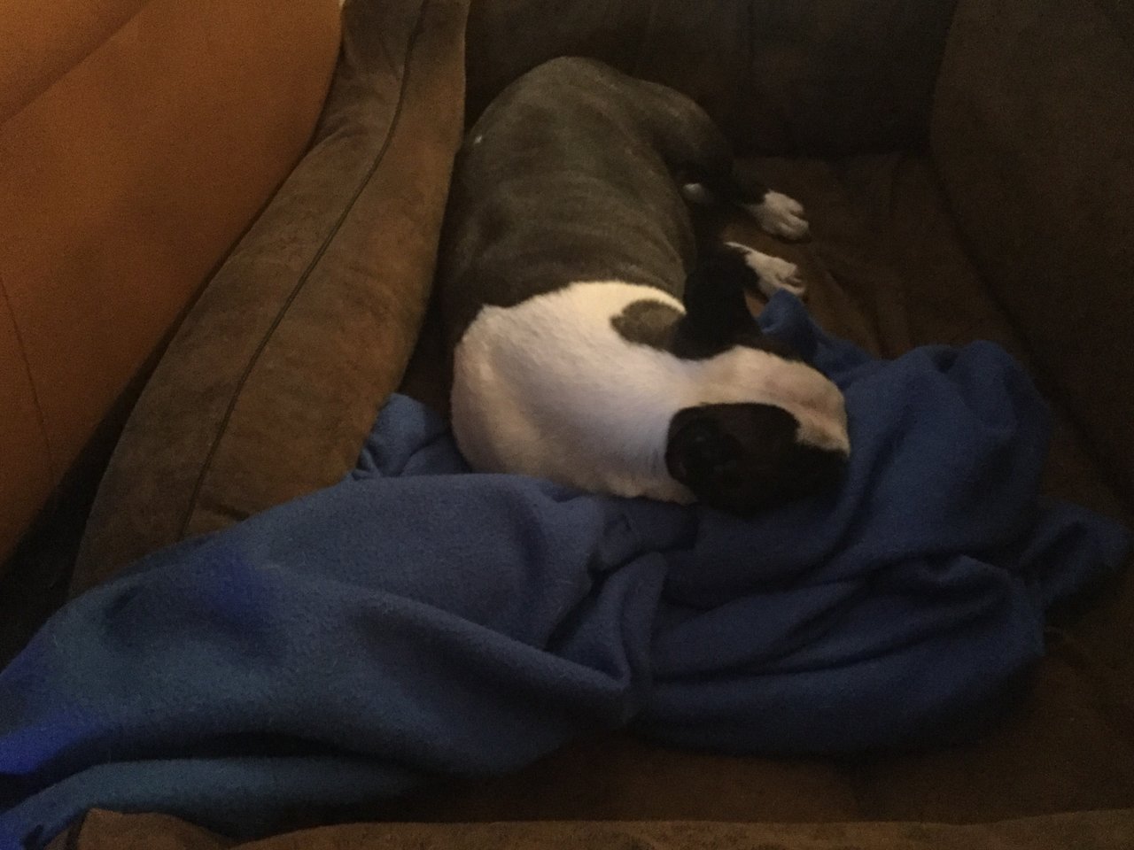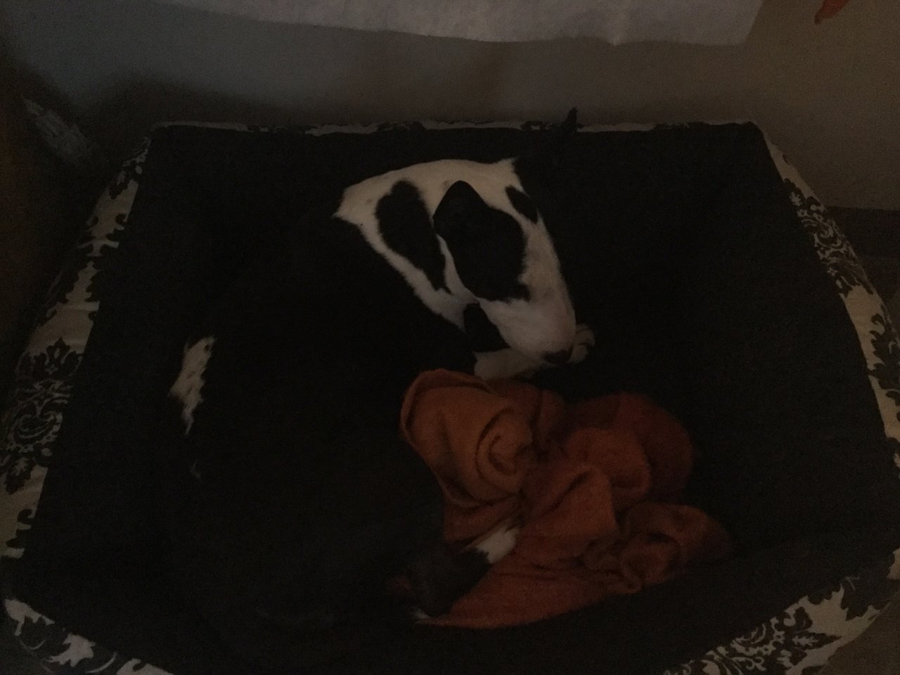 FressstarreSo sieht ein Bullterrier aus der gerade eine Schüssel Lachs gefressen hat.