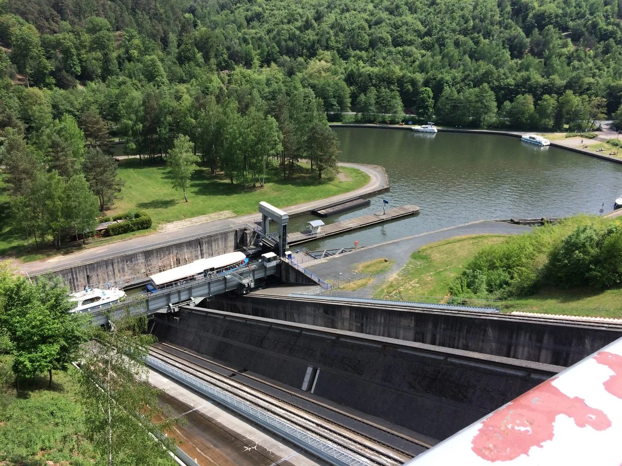 Ja, das war unglaublich interessant, wie die Schiffe samt Wasser mit dem Schrägaufzug runter und hoch gefahren sind. Früher gab es auf 4km 17 Schleusen, in einem engen Tal, jetzt reicht diese eine aus.Das sieht ja cool aus...![]()