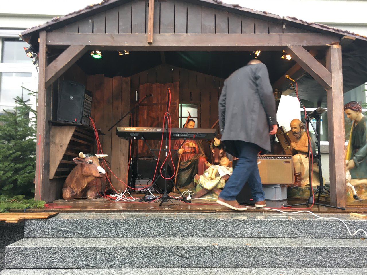 heute machen wir die musikalische Umrahmumg des Krippenspiels, im strömenden Regen...