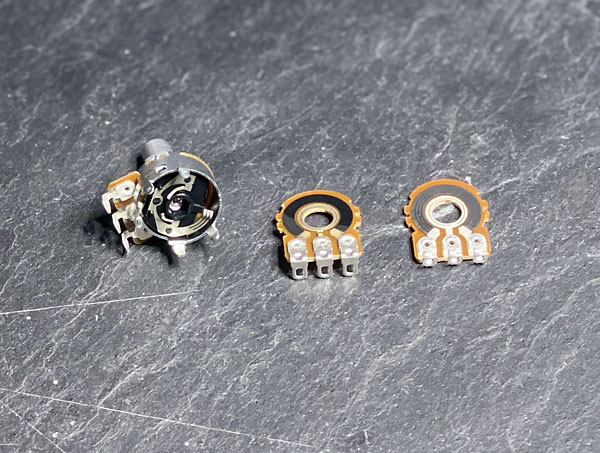 Ich möchte die untere Schleiferbahn des A10k-Potis durch die C1k-Schleiferbahn ersetzen. Also löse ich die Ösen des A10k-Potis und somit auch die untere Schleiferbahn (Bildmitte A10k, Bild rechts C1k):