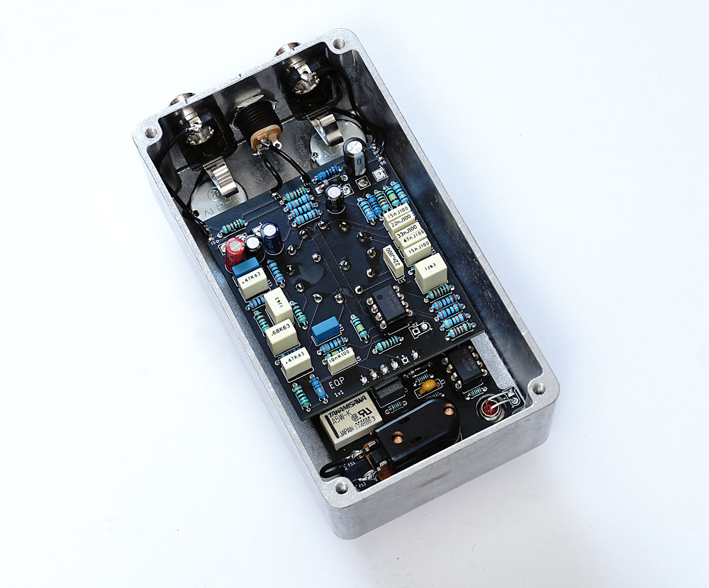 Das ist "meiner", gelle?Schon seit längerer Zeit wollte ich mal eine Relais-Bypass-Schaltung testen. Bei einem zerofiveAudio LowRider Clone war endlich mal genügend Platz dafür: