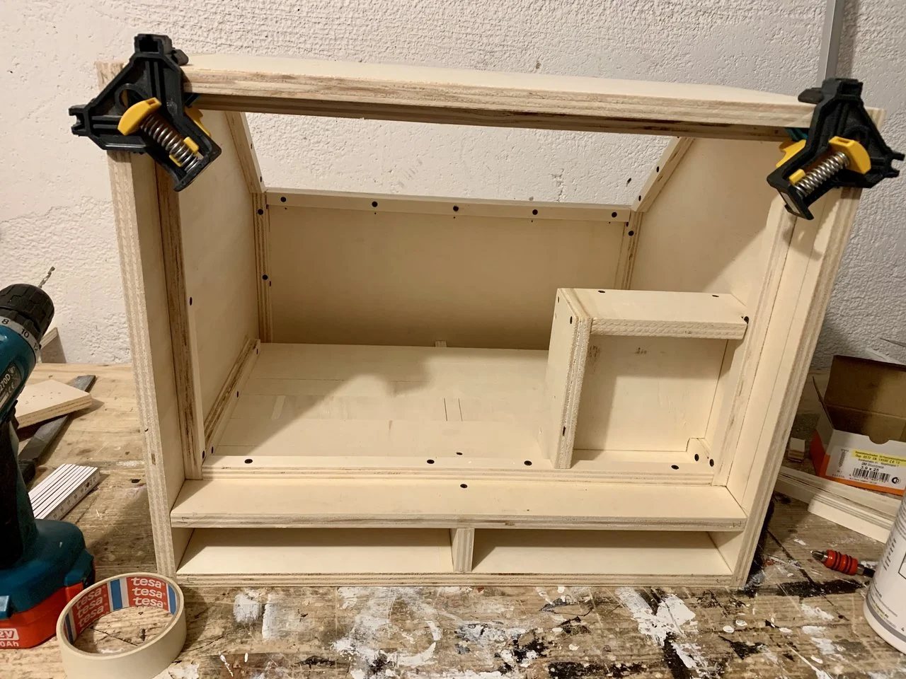 Gestern ging es daran die ersten Rahmenteile einzukleben. Ich mach dies einfach nur deshalb, dass ich eine größere Leimfläche zum Verbinden der Teile habe und zudem auch damit ich damit rechte Winkel hinbekomme. Meine kleine Werkbank hat auch nicht genügend Schraubzwingen. daher müssen hier Schrauben für den notwendigen Druck beim Leimen sorgen.