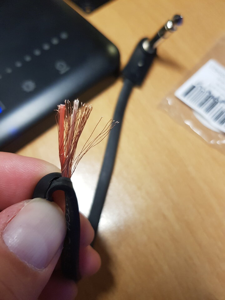 Die Idee war, ein TRS-Winkelkabel abzuschneiden und dieses durch die Öffnung hindurch zu führen. Innen wollte (bzw. will) ich dann alles verlöten. Jetzt habe ich mal so ein Kabel aufgeschnitten. Ich dachte da sind jetzt drei Kabel drin. Aber denkste: Bei mir sieht das so aus: