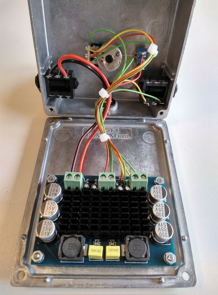 Ein- Ausgangsbuchsen müssen isoliert am Gehäuse montiert werden, bzw. Masse von Input/DC Buchse darf keine Verbindung zur Masse der Speakerbuchse haben!
