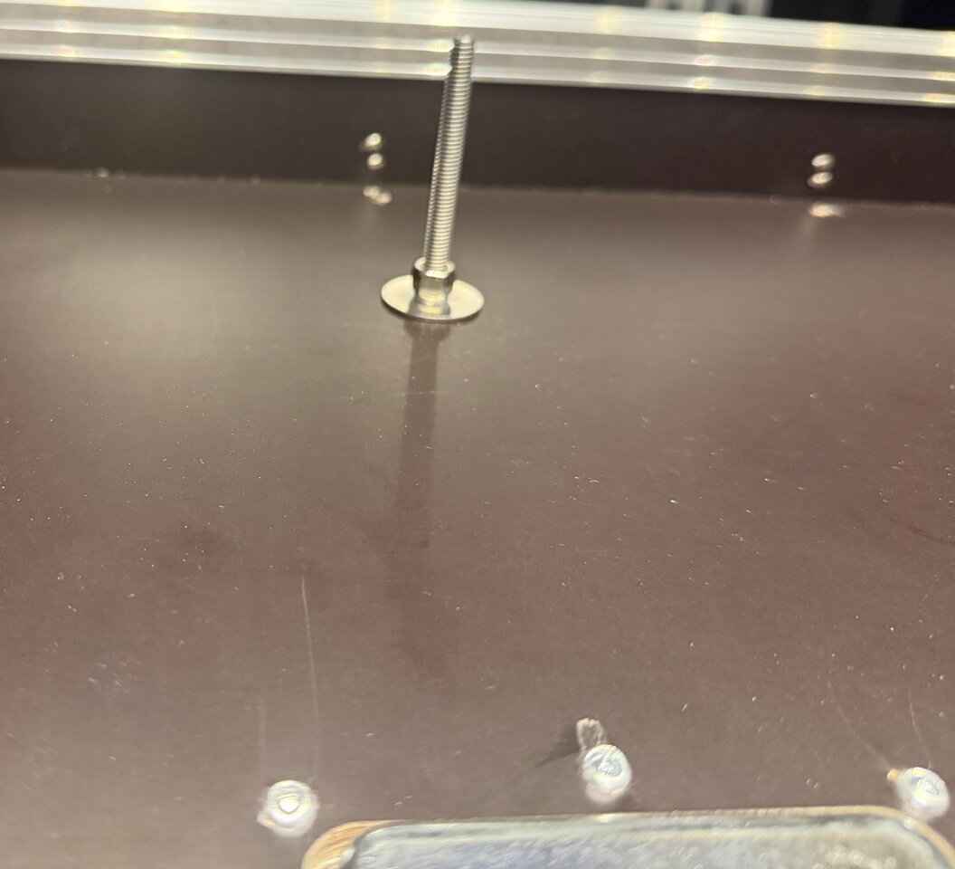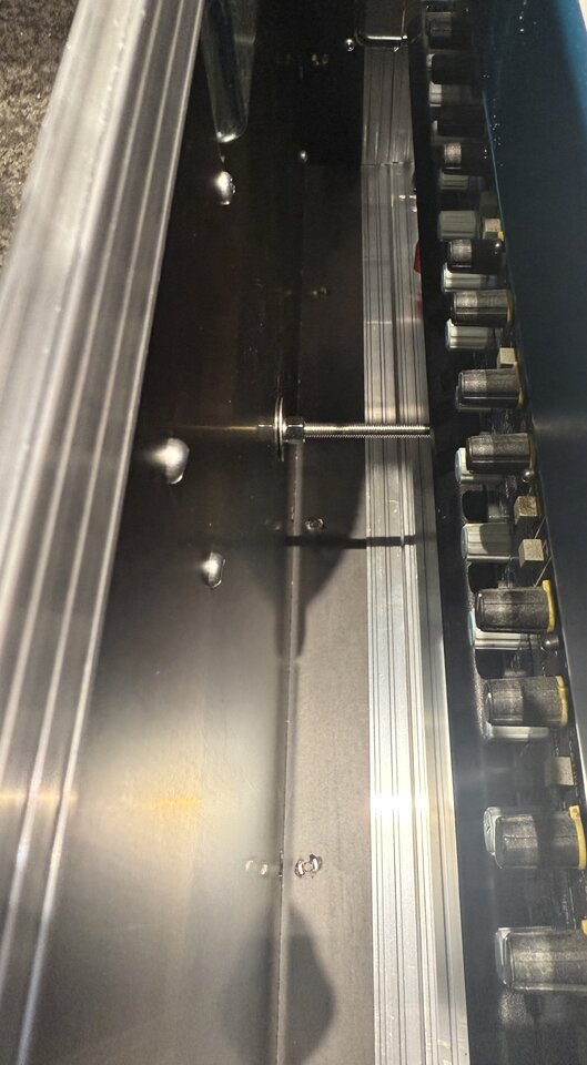 Diese habe ich in 70mm Länge so in die Deckel eingebaut, dass sie die Beweglichkeit des Mischpultes und das Öffnen der Rackschublade verhindern. Oben drauf kommen noch Hutmuttern und fertig.