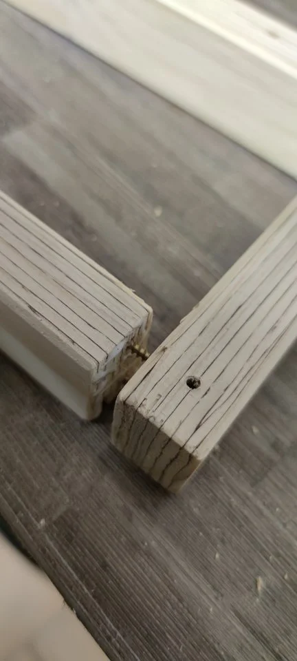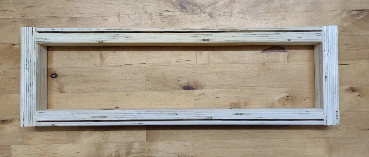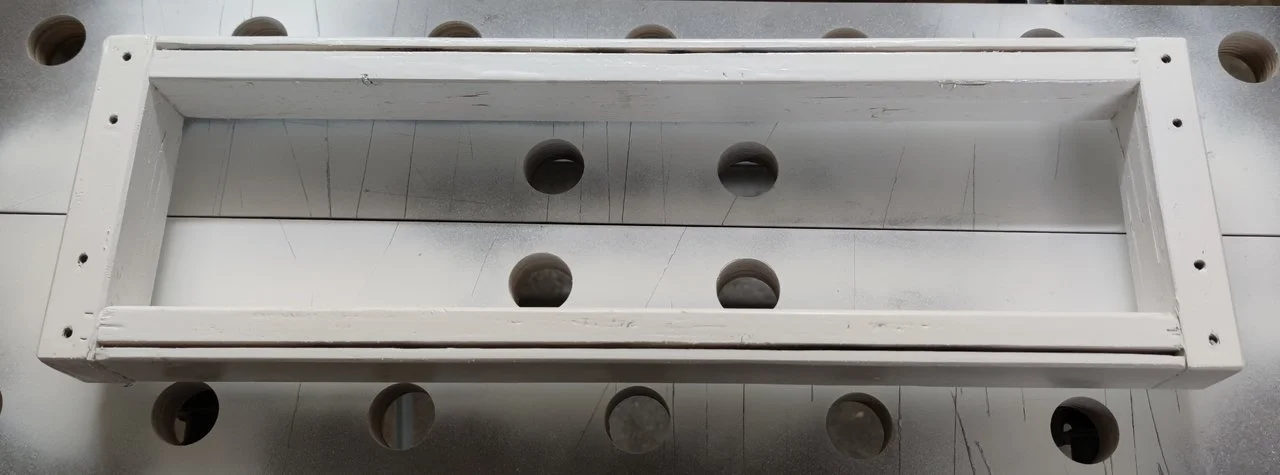 Zuerst werden die Kanthölzer auf die passenden Länge abgeschnitten (Kappsäge). 2 Stück mit 15 cm und 2 Stück mit 44,5 cm. Zusätzlich säge ich einen 12cm tiefen Schlitz in 44,5cm langen Kanthölzer (Tischkreissäge), damit das U-Profil der Rackblende „Platz hat“.